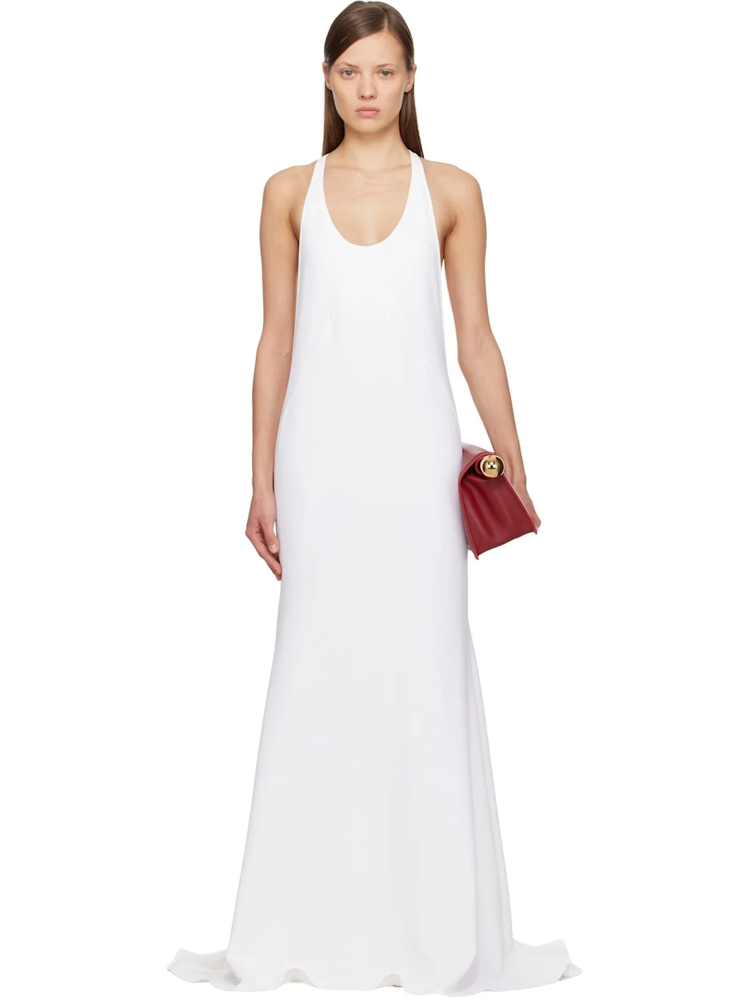 Bias-cut stretch viscose-blend crepe maxi dress. · Scoop neck · Racer back · Train at back hem · Partial recycled polyester chiffon lining Supplier color: White Body: 65% viscose, 32% acetate, 3% elastane. Lining: 100% recycled polyester. Made in Bulgaria 252553F055002