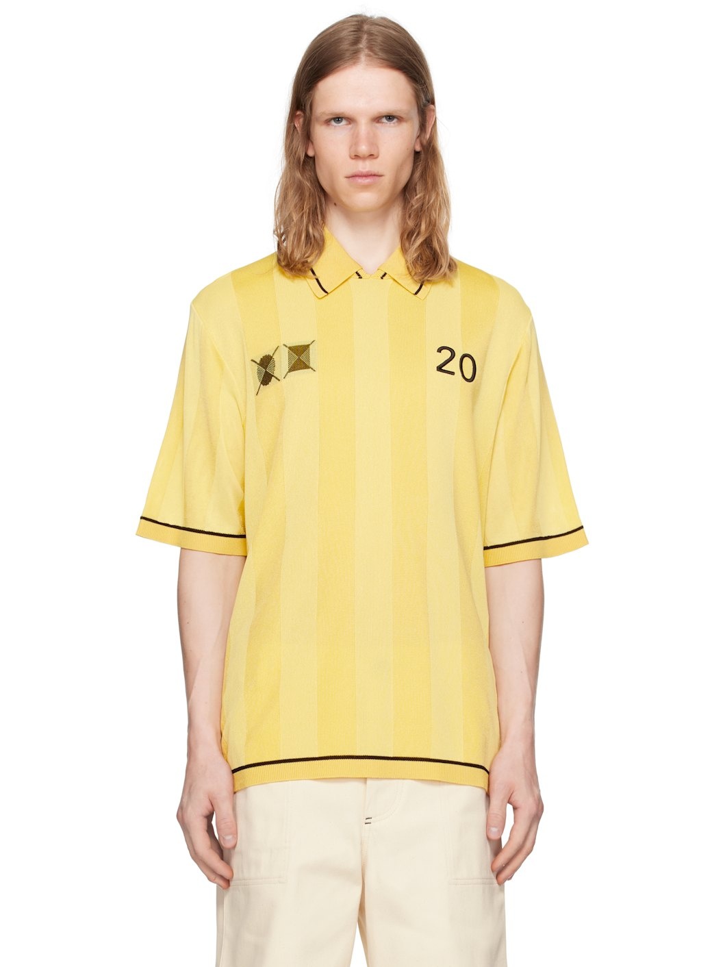 Knit stretch viscose-blend polo. Jacquard stripes throughout. · Striped rib-knit spread collar, hem, and cuffs · Jacquard graphic and embroidered text at chest · Jacquard logo graphic at back Part of the La Croisiere collection. Supplier color: Light yellow 91% viscose, 8% polyamide, 1% elastane. Made in Romania 251553M212005