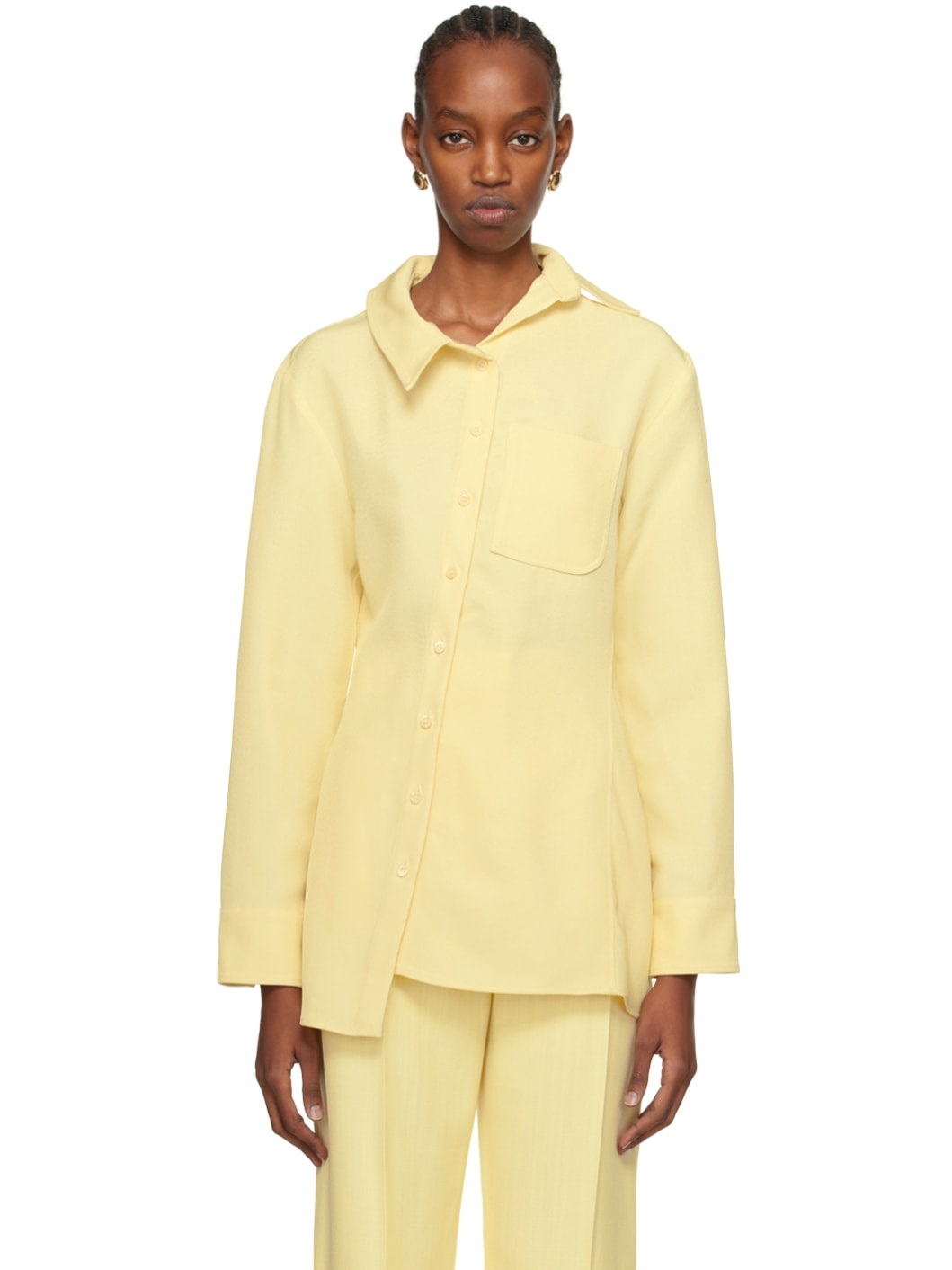 Viscose- and nylon-blend canvas shirt. · Asymmetrical construction · Pointed collar · Offset button closure · Patch pocket · Single-button barrel cuffs · Logo locker loop at back collar · Box pleat at back yoke · Mother-of-pearl hardware Part of the Les Sculptures collection. Supplier color: Pale yellow 88% viscose, 12% polyamide. Made in Bulgaria 241553F109014