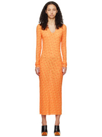 Semi-sheer stretch polyester mesh dress. Logo pattern printed throughout. · Layered construction · V-neck · Raw edge at hem Supplier color: Logo orange 92% polyester, 8% elastane. Made in Portugal 241772F054000