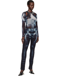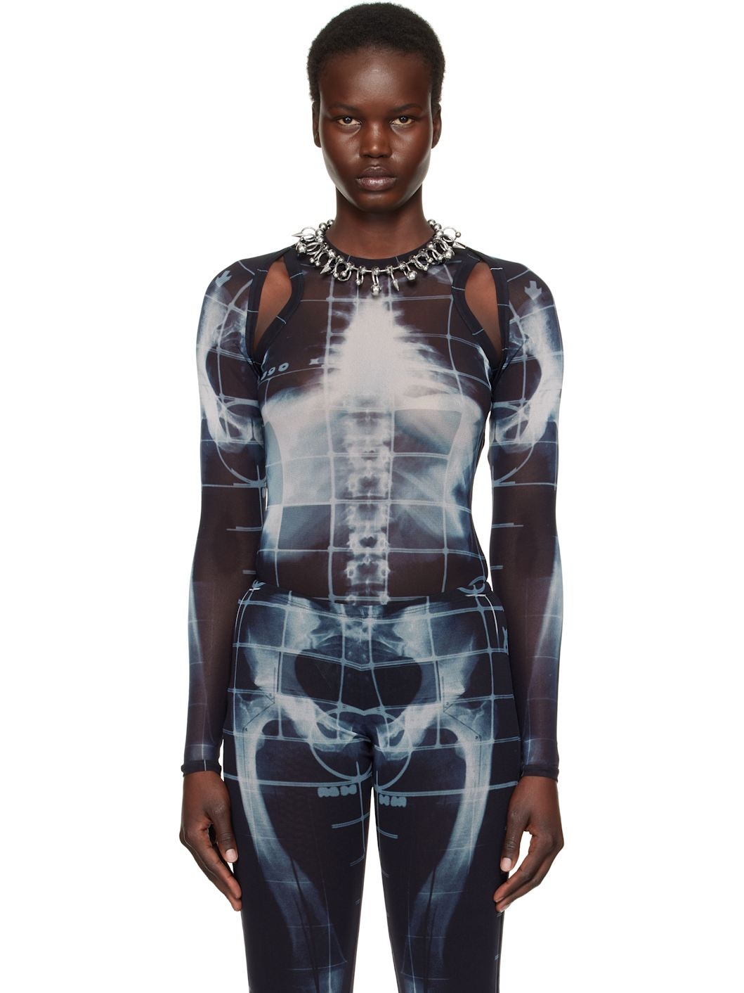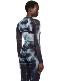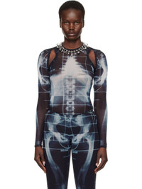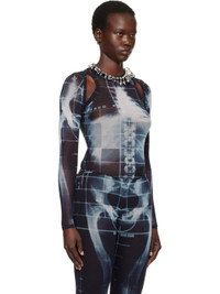 Semi-sheer nylon tulle bolero-style cardigan. Graphic and check pattern printed throughout. · Open front · Locker loop at back collar Supplier color: Black/Navy/Light Blue 100% nylon. Made in Italy 251808F110020