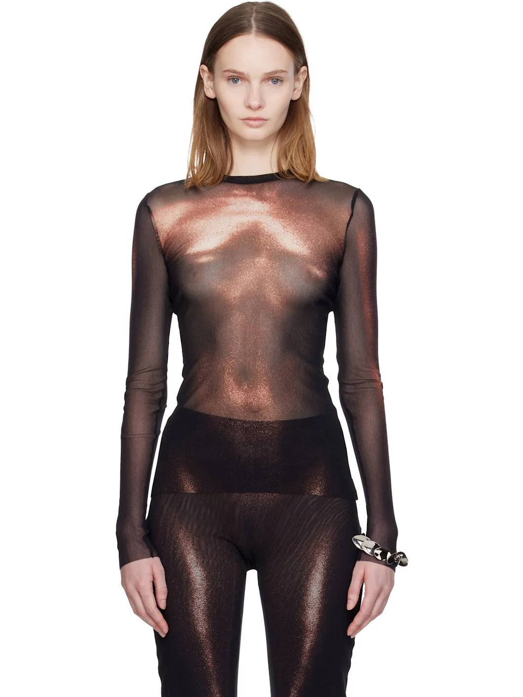 Semi-sheer nylon tulle top. · Trompe l'œil graphic printed throughout · Slim-fit · Crewneck · Raw edge at hem and cuffs · Locker loop at back collar Supplier color: Black/Brown 100% polyamide. Made in Italy 252808F110017