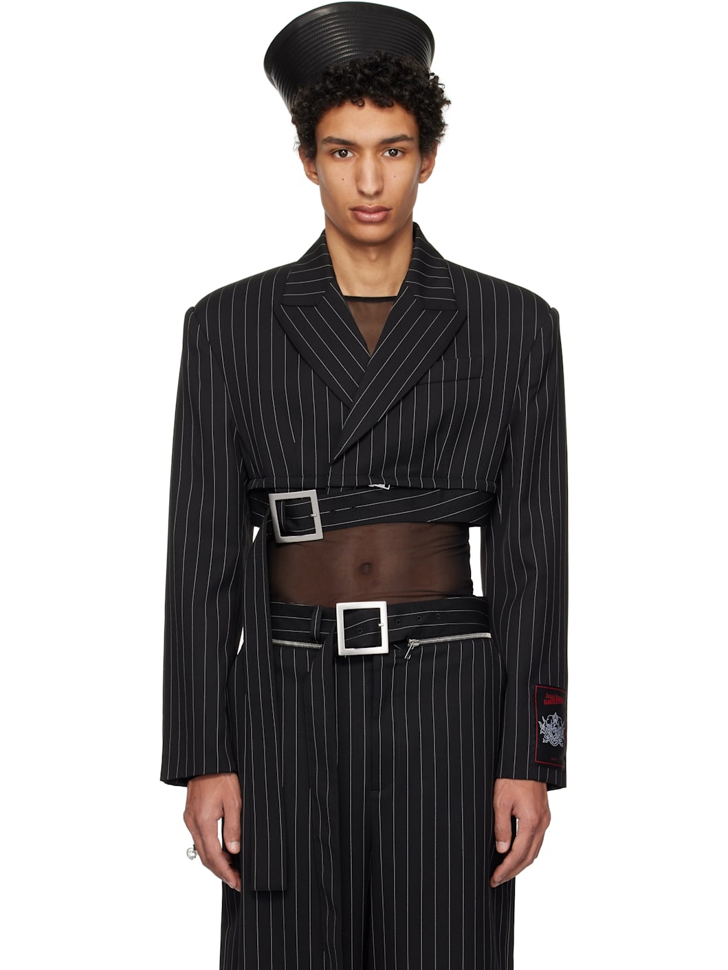 Virgin wool twill blazer. Pinstripes throughout. · Peaked lapel · Concealed button closure · Patch pocket at chest · Padded shoulders · Four-button surgeon's cuffs · Detachable pin-buckle belt at cropped hem · Locker loops at back collar and and hem · Full viscose satin lining Supplier color: Black/White Body: 100% virgin wool. Lining: 100% viscose. Made in Italy 251808M195000
