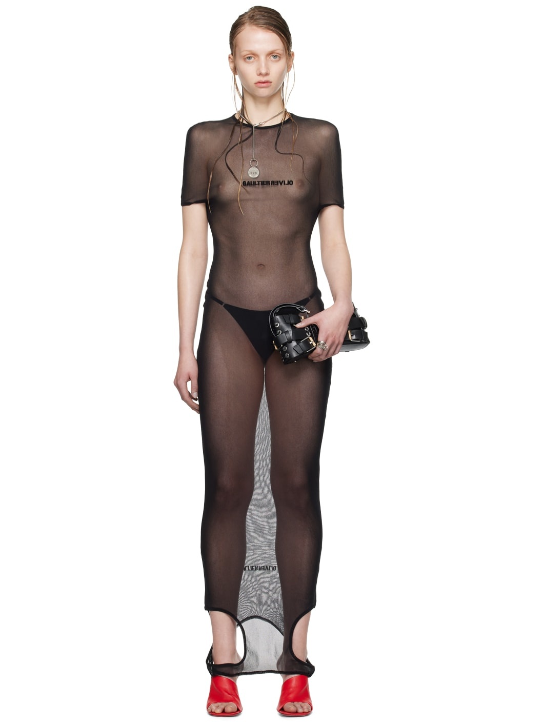 Sheer nylon mesh dress. Raw edges throughout. · Crewneck · Flocked logo at front · Cutouts at hem · Locker loop at back collar · Flocked logo at back hem Part of the Jean Paul Gaultier x Shayne Oliver collaboration. Supplier color: Black/Black 100% polyamide. Made in France 242808F055031