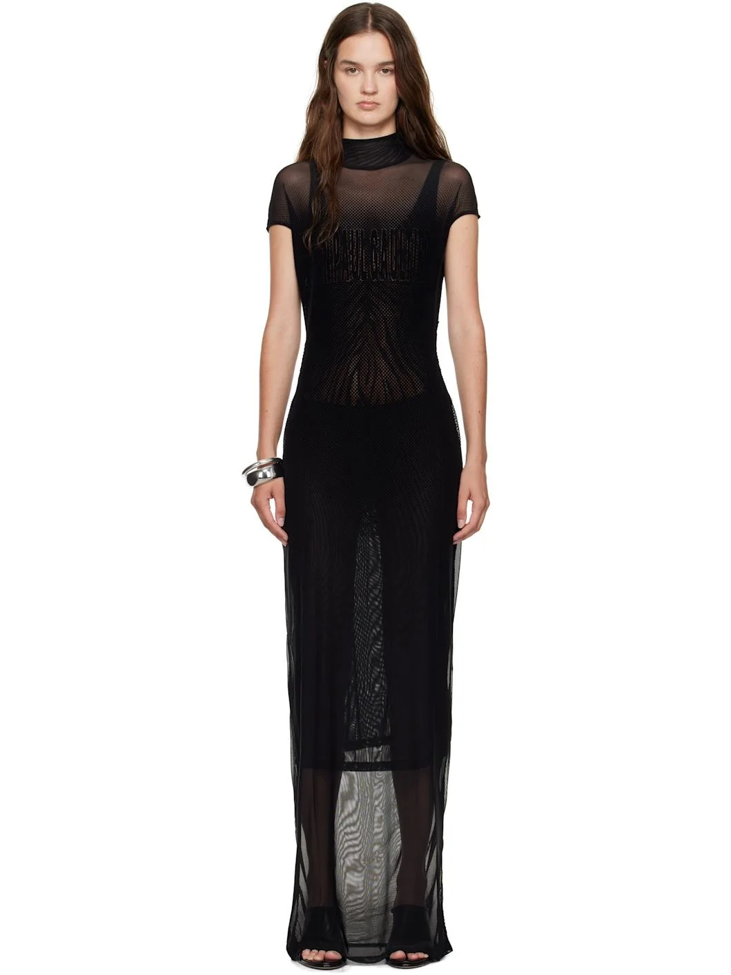 Stretch nylon mesh maxi dress. · Polka-dot pattern flocked throughout · Mock neck · Logo flocked at chest · Cutout at side seams · Cap sleeves · Locker loop at back collar · Partially lined Supplier color: Black 94% polyamide, 6% elastane. Made in Portugal 252808F055004