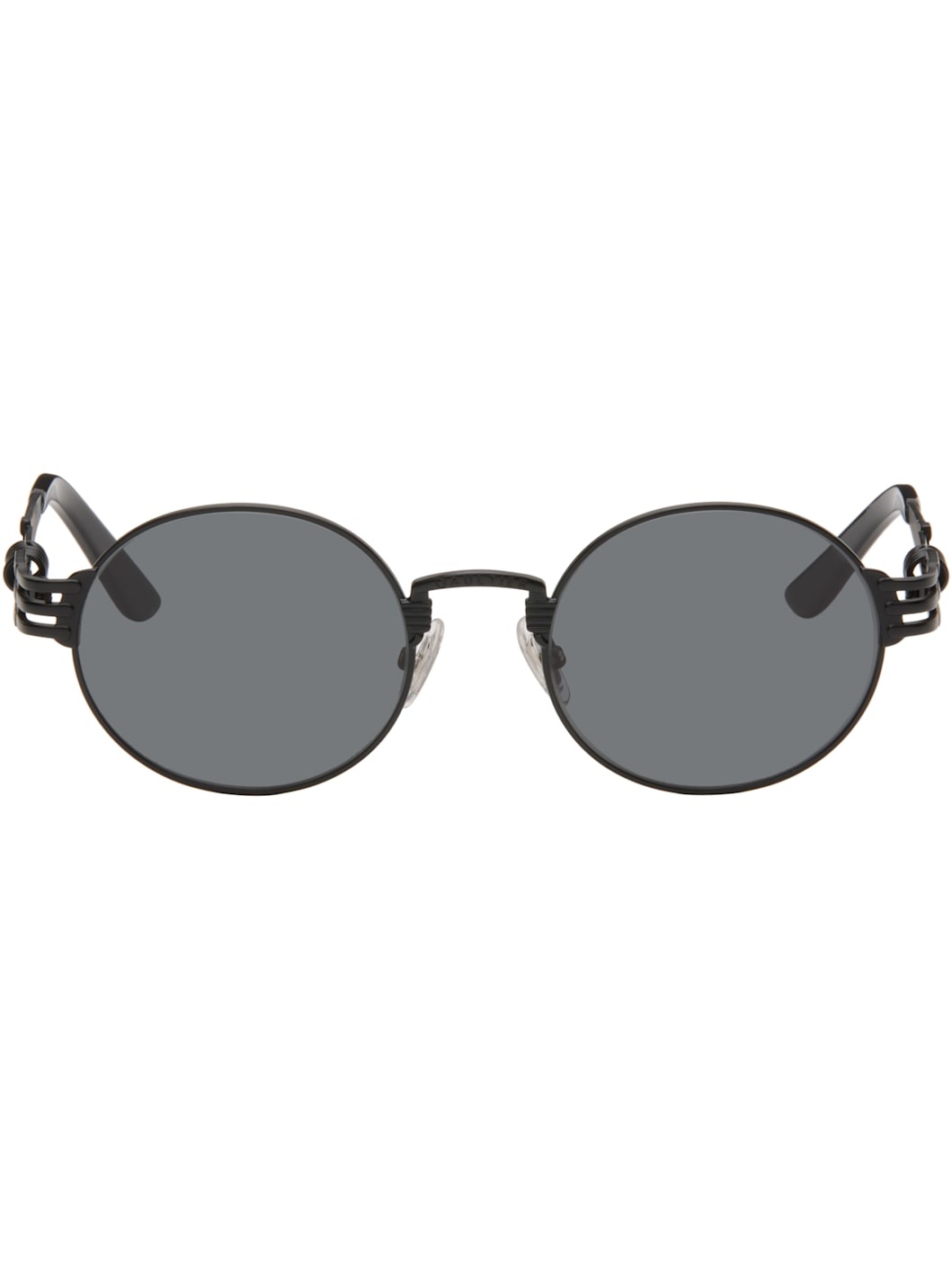 Round metal-frame sunglasses. · Black lenses, category 3 · 100% UVA/UVB protection · Logo engraved at bridge · Adjustable rubber nose pads · Spring hardware at temples · Mazzucchelli acetate temple tips · Includes case · Size: 51.21 145 Supplier color: Black Metal. Made in France 252808M134006