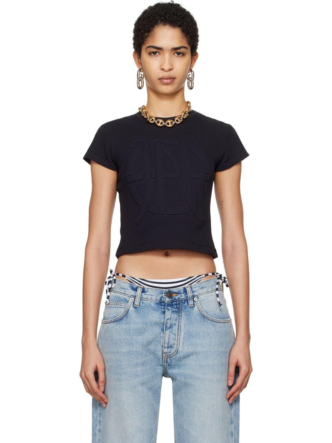 Waffle-knit cotton T-shirt. · Rib-knit crewneck · Logo embossed at front · Cropped hem · Locker loop at back collar Supplier color: Black 100% cotton. Made in Portugal 251808F110009