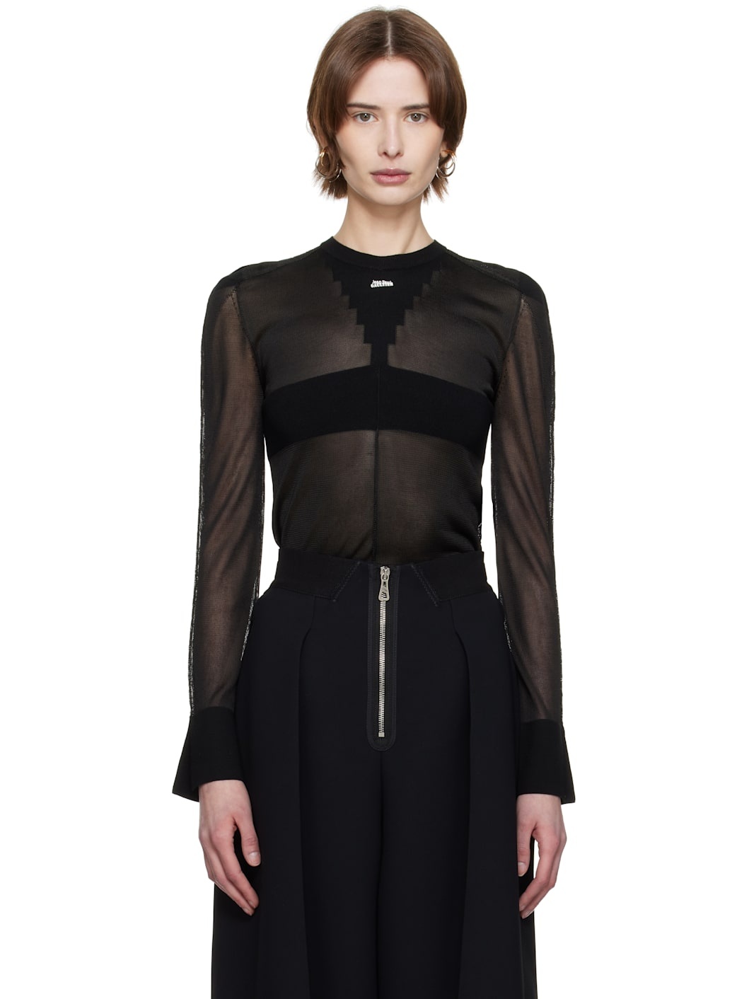 Semi-sheer knit viscose-blend sweater. · Paneled construction · Crewneck · Logo bonded at chest · Central seam at front and back · Vented cuffs · Locker loop at back collar Supplier color: Black 92% viscose, 8% polyester. Made in Italy 251808F110023