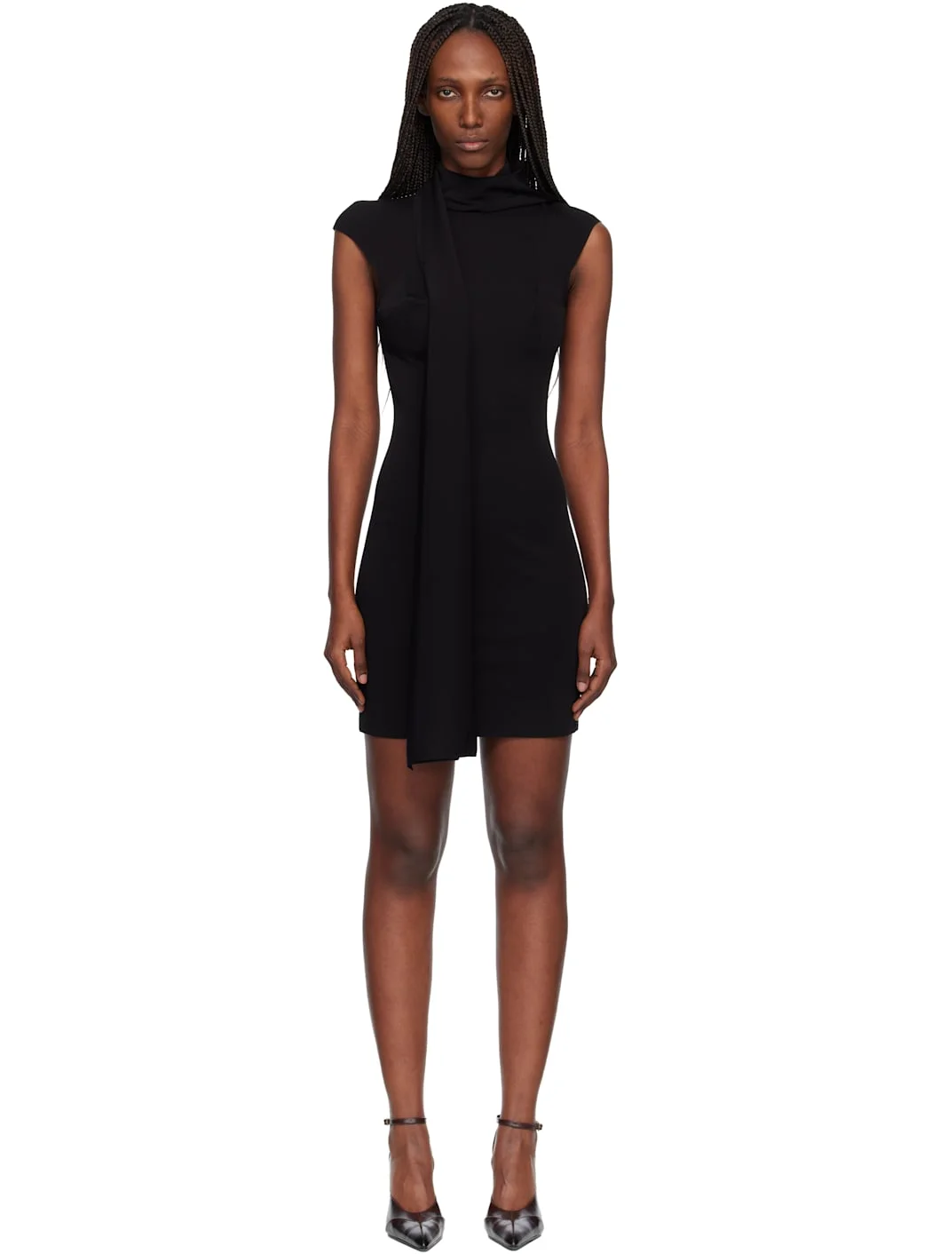 Stretch viscose jersey minidress. · Integrated scarf-style panel at mock neck · Structural padded cups at chest · Logo embroidered at side seam · Raw edge at armscyes · Concealed zip closure at back · Contrast stitching in white Supplier color: Black 98% viscose, 2% elastane. Made in France 252808F052006