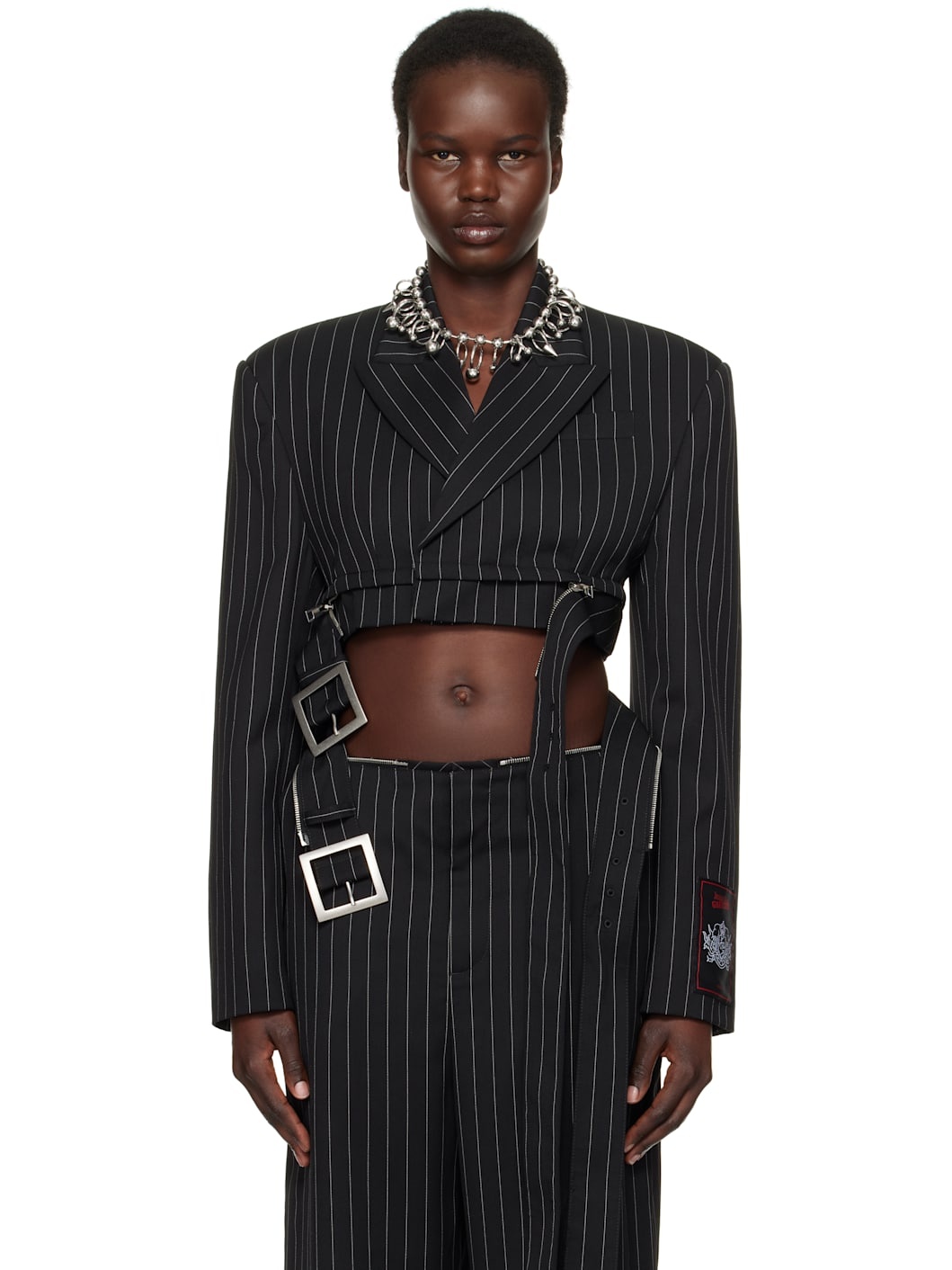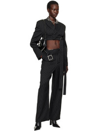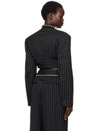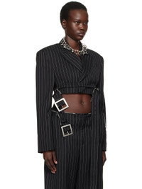 Virgin wool twill blazer. Pinstripes throughout. · Peaked lapel · Concealed button closure · Welt pocket · Two-way zip fastening at cropped hem · Detachable and adjustable pin-buckle belt · Padded shoulders · Four-button surgeon's cuffs · Locker loop at back collar and cropped hem · Full viscose satin lining Supplier color: Black/White Body: 100% virgin wool. Lining: 100% viscose. Made in Italy 251808F057000