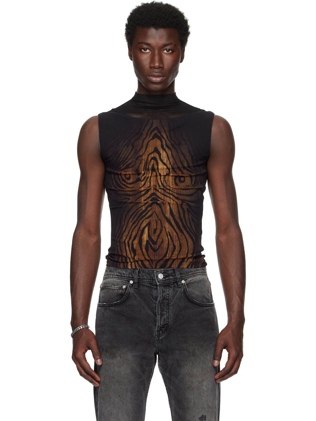 Double-faced nylon mesh turtleneck. · Semi-sheer · Graphic pattern printed throughout · Raw edge at collar · Locker loop at back collar Supplier color: Black/Brown 100% polyamide. Made in Italy 252808M214003