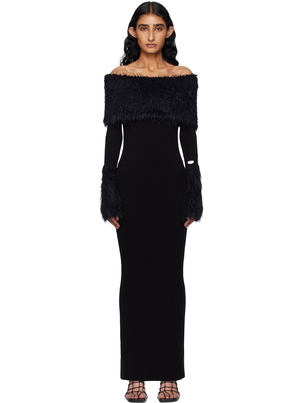 Rib-knit viscose-blend maxi dress. · Off-the-shoulder construction · Shag knit wool-blend trim at straight neck and cuffs · Logo plaque at sleeve · Locker loop at back collar · Central vent at back hem Supplier color: Black Body: 70% viscose, 30% polyester. Trim: 46% polyamide, 31% wool, 14% acrylic, 9% mohair. Made in Italy 252808F055008