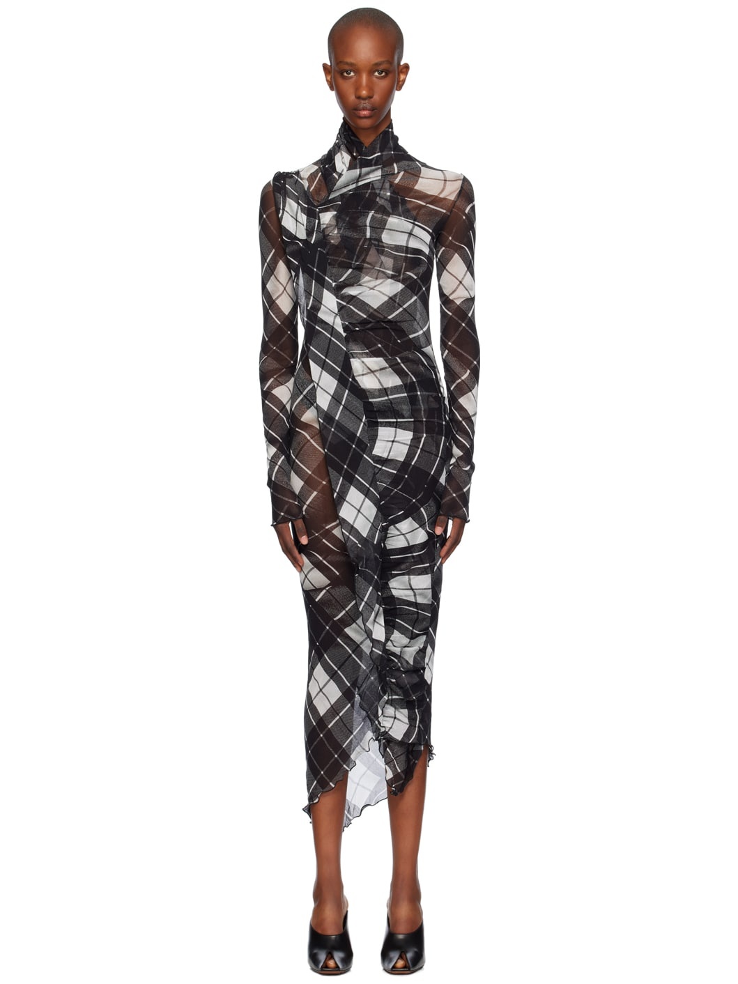 Semi-sheer nylon tulle midi dress. Modified check pattern and lettuce edges throughout. · Cowl neck · Gathering and ruffled trim at front · Locker loop at back collar Supplier color: Black/Grey/White 100% polyamide. Made in Italy 242808F054013