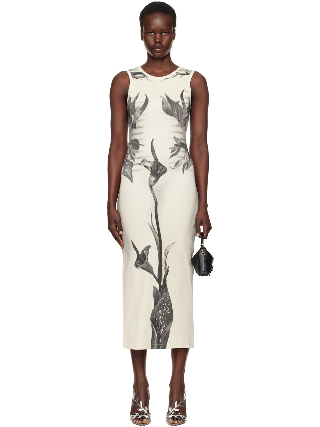 Stretch cotton ribbed jersey maxi dress. Stripes and floral pattern printed throughout. · Crewneck · Vent at side seam · Locker loop at back collar Supplier color: White/Grey/Black 95% cotton, 5% elastane. Made in Portugal 251808F055006
