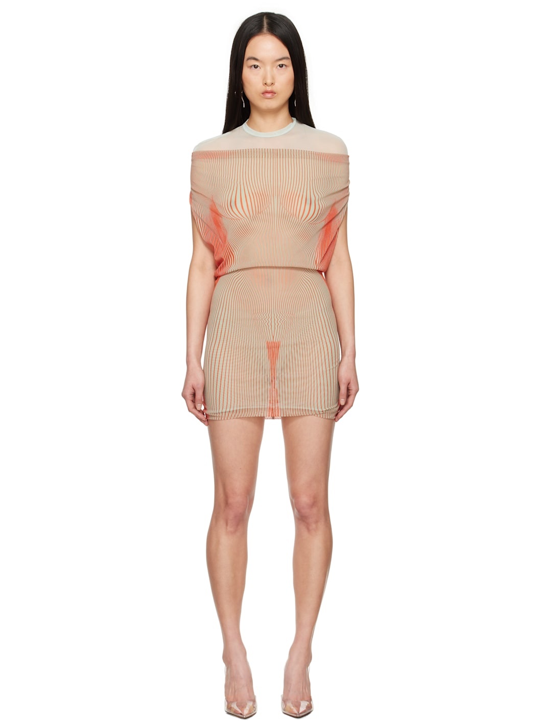 Double-faced sheer nylon mesh minidress. Striped trompe-l'œil pattern printed throughout. · Crewneck · Locker loop at back collar · Ruching at low back Supplier color: Mint coral 100% polyamide. Made in Italy 251808F052009