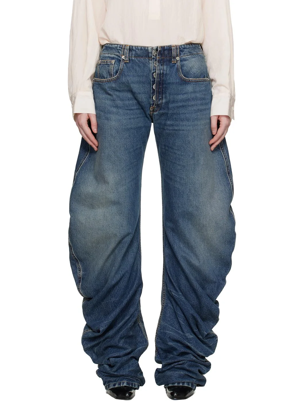 Non-stretch denim jeans. · Fading, whiskering, and subtle distressing throughout · Belt loops · Five-pocket styling · Button fly · Curved extended legs · Logo patch at back waistband · Contrast stitching in tan Supplier color: Vintage blue 100% cotton. Made in Italy 252808F069003