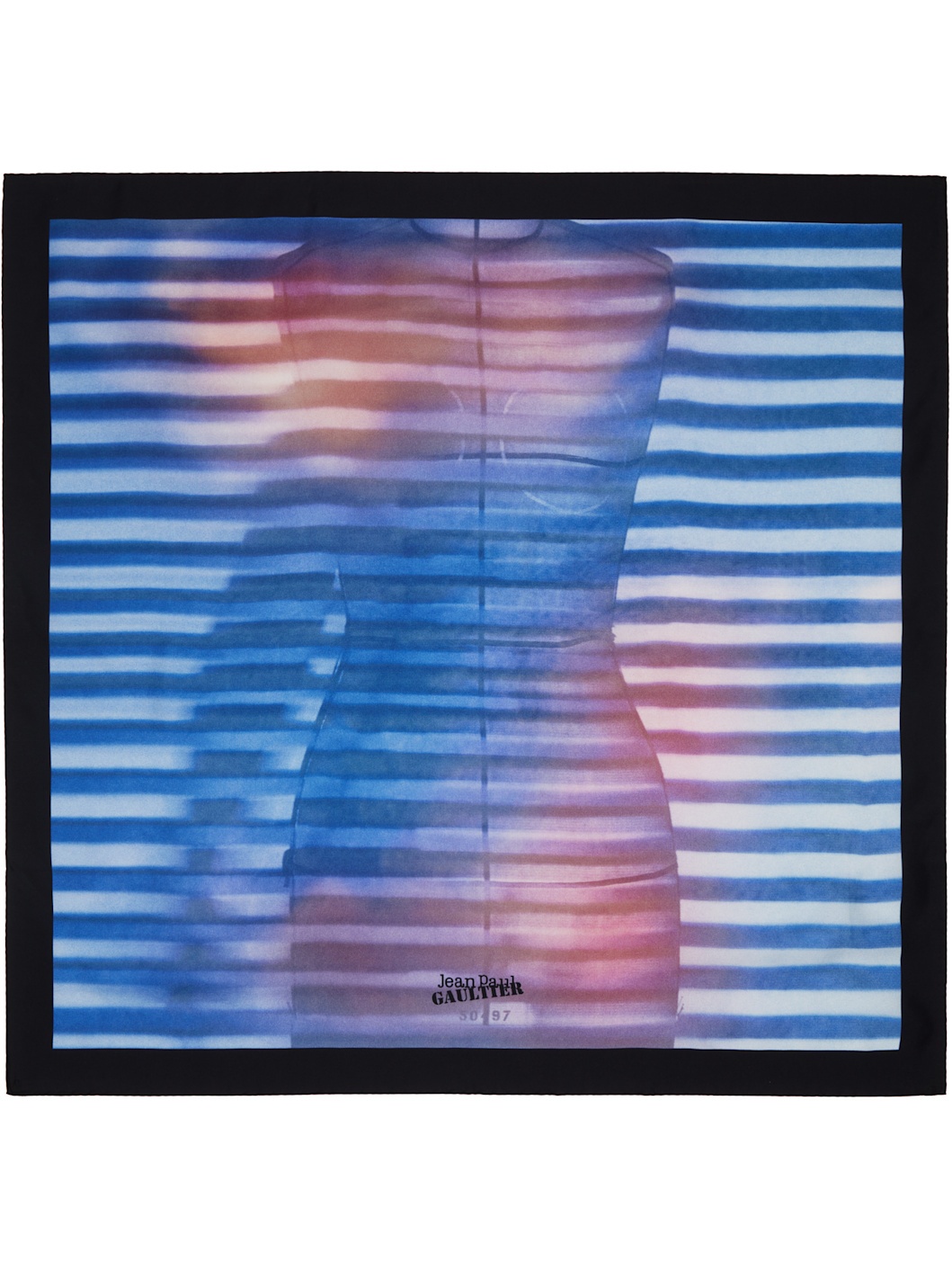 Square silk twill scarf. · Stripes and graphic printed throughout · Logo printed at face and back face · L26.5" x W26.5" Supplier color: Blue 100% silk. Made in Italy 252808F029001
