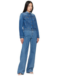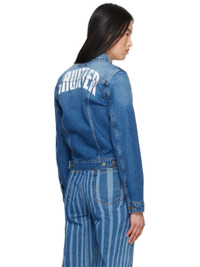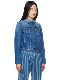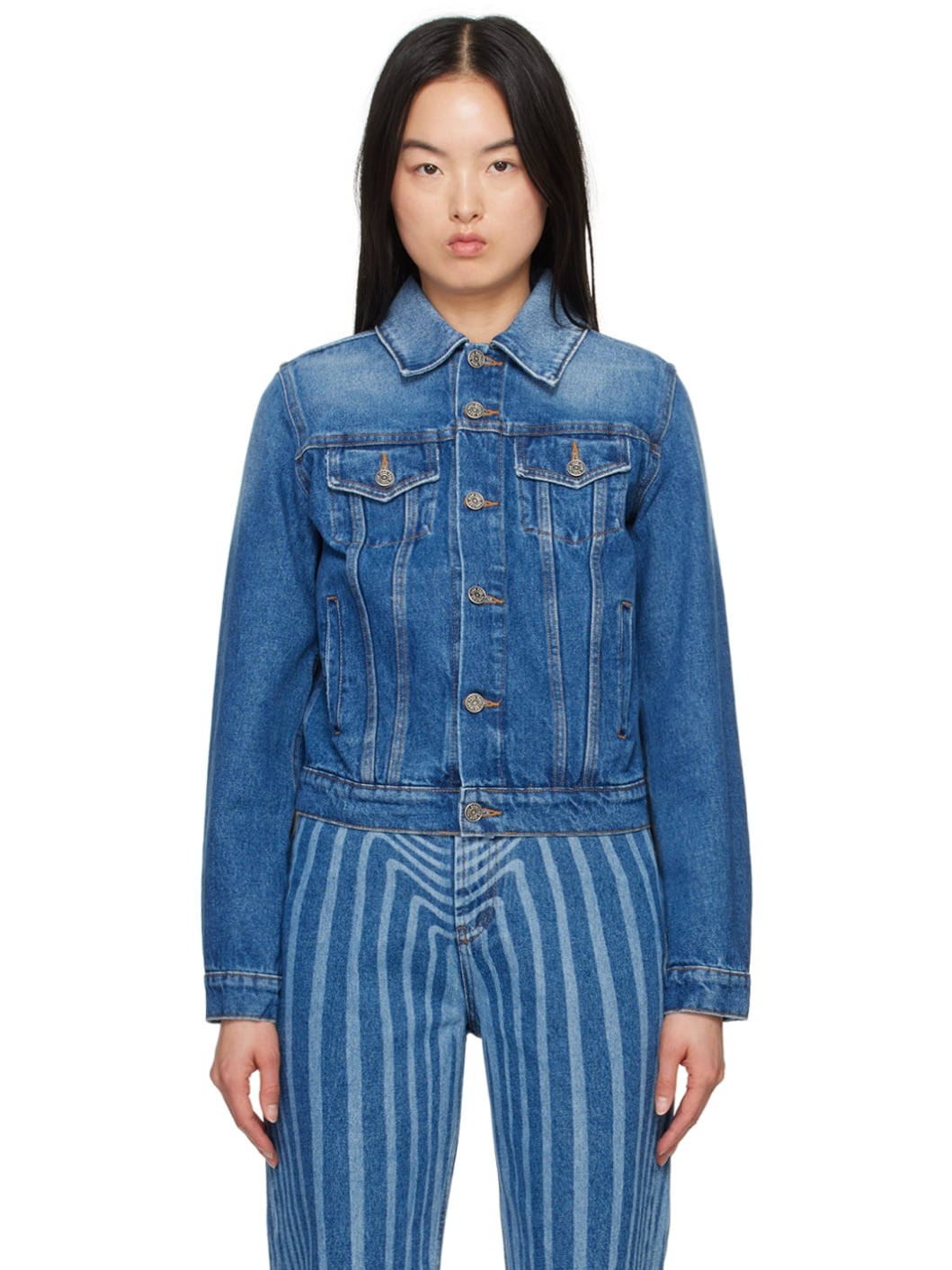 Non-stretch denim jacket. Subtle fading throughout. · Paneled construction · Spread collar · Button closure · Flap and welt pockets · Button fastening at cuffs · Locker loop at back collar · Logo printed at back yoke · Adjustable button tabs at back hem · Unlined · Logo-engraved gunmetal-tone hardware · Contrast stitching in tan Supplier color: Vintage blue 100% cotton. Made in Portugal 242808F060001