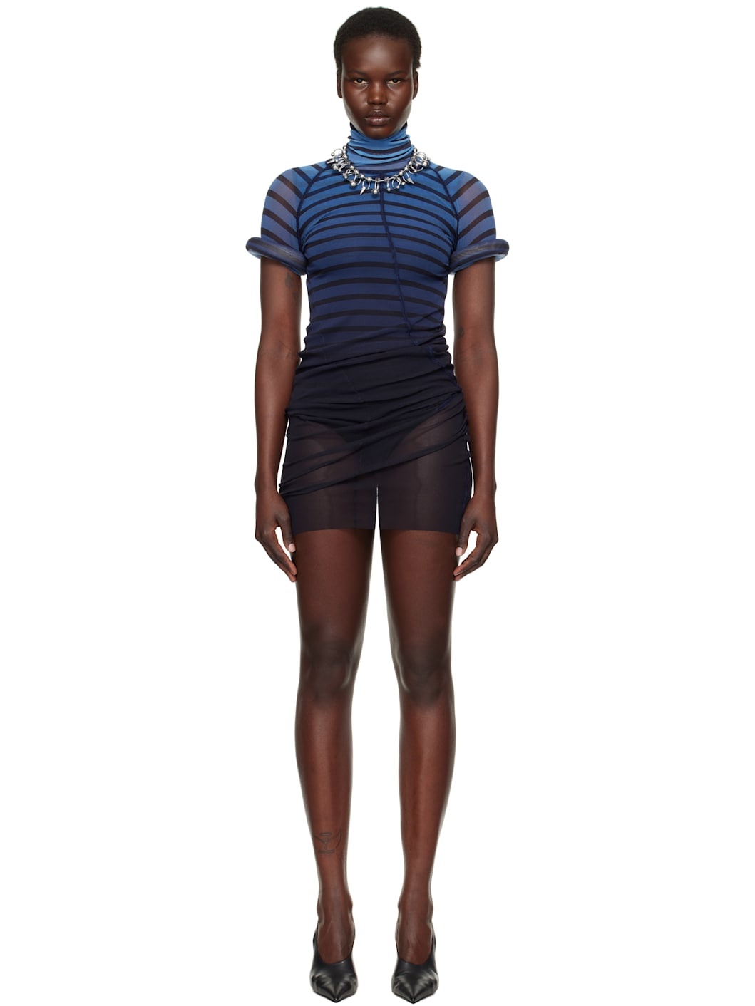 Semi-sheer nylon tulle minidress. Stripes, ruching, and twisted seams throughout. · Raw edge at turtleneck and hem · Raglan sleeves · Padded tubular trim at cuffs · Locker loop at back collar · Bodysuit-style stretch nylon jersey underlay Supplier color: Black/Navy/Light blue Body 1: 100% nylon. Body 2: 80% nylon, 20% elastane. Fill: 100% polyurethane foam. Made in Italy 251808F052011