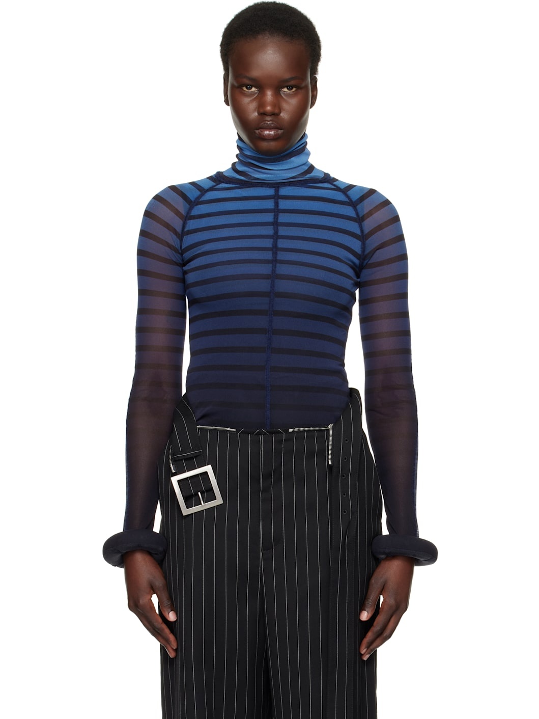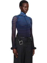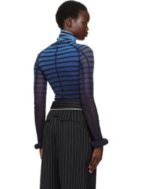 Semi-sheer nylon tulle turtleneck. Stripes and raised seams throughout. · Raw edge at turtleneck and hem · Twisted seams at raglan sleeves · Padded tubular trim at cuffs · Locker loop at back collar · Stretch nylon jersey underlay Supplier color: Black/Navy/Light Blue Body 1: 100% nylon. Body 2: 80% nylon, 20% elastane. Fill: 100% polyurethane foam. Made in Italy 251808F099000