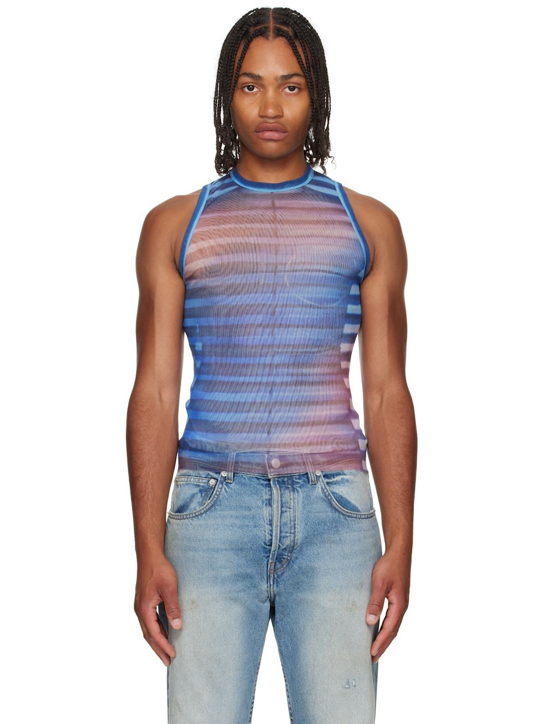 Nylon mesh tank top. · Stripes and trompe l'oeil graphic printed throughout · Crewneck · Raw edge at hem · Locker loop at back collar · Fully lined Supplier color: Light blue/Blue/Peach 100% polyamide. Made in Italy 252808M214002