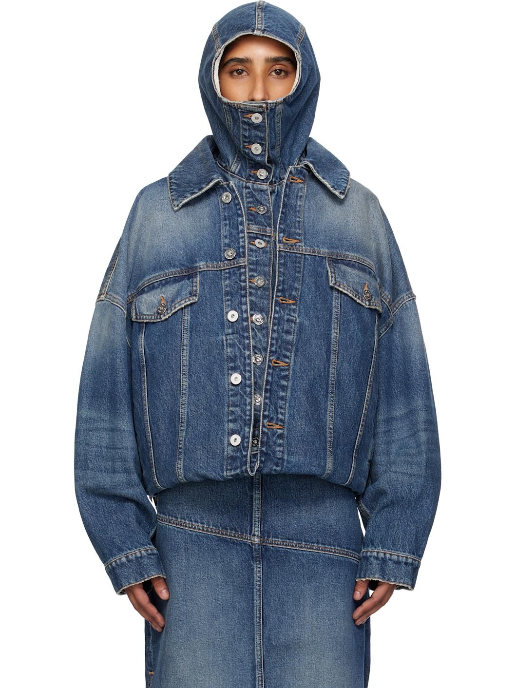 Non-stretch denim jacket. · Fading and subtle distressing throughout · Layered construction · Integrated balaclava-style hood at vest underlay · Spread collar · Button closures · Flap pockets at chest · Welt pockets at waist · Cropped hem · Dropped shoulders · Buttoned cuffs · Locker loop at back collar · Leather logo patch at back hem · Logo-engraved silver-tone hardware · Contrast stitching in tan Supplier color: Vintage blue Body: 100% cotton. Lining: 65% polyester, 35% cotton. Made in Italy 252808F060003