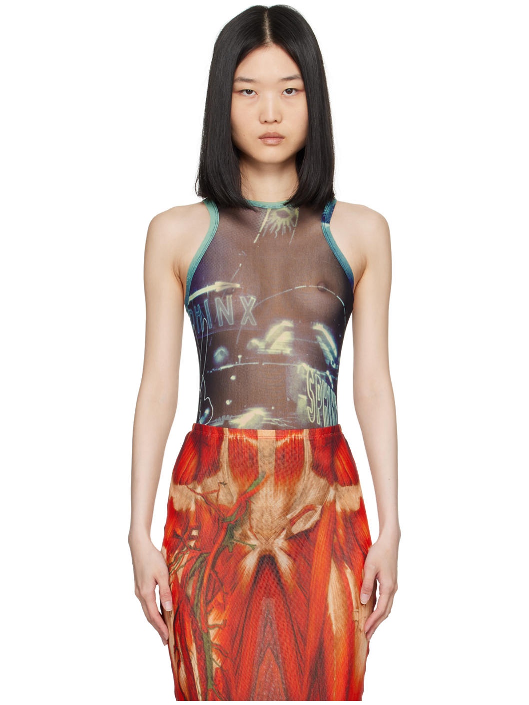 Semi-sheer nylon tulle bodysuit. Graphic printed throughout. · Crewneck · Press-stud fastening at bottom · Locker loop at racerback Part of the Fashion Fiction collection. Supplier color: Navy/Light blue/Black 100% polyamide. Made in Italy 242808F358014