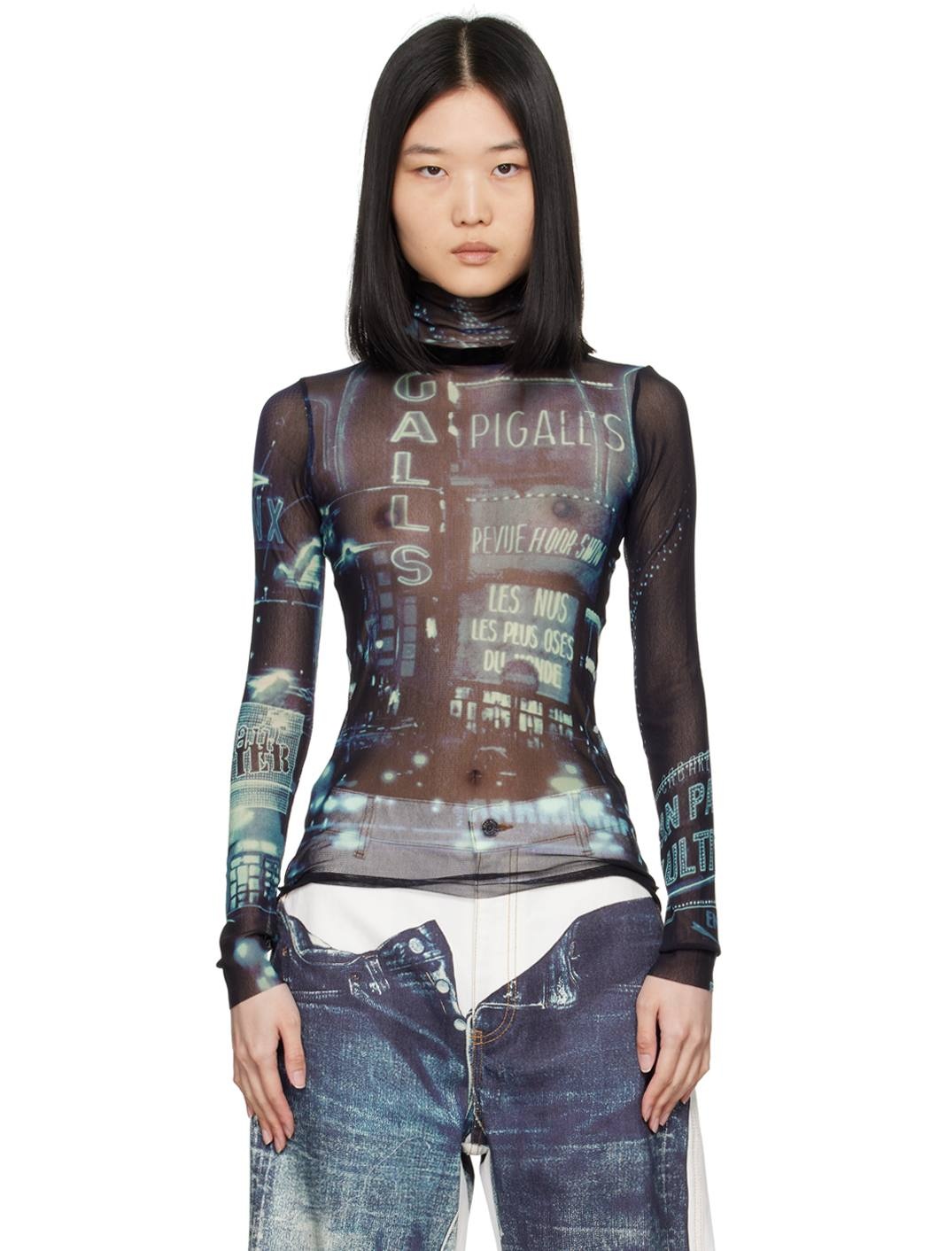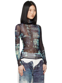 Semi-sheer nylon tulle turtleneck. Graphic printed throughout. · Velvet trim at collar · Raw edge at turtleneck, hem, and cuffs · Locker loop at back collar Part of the Fashion Fiction collection. Supplier color: Navy/Light blue/Black 100% polyamide. Made in Italy 242808F099005