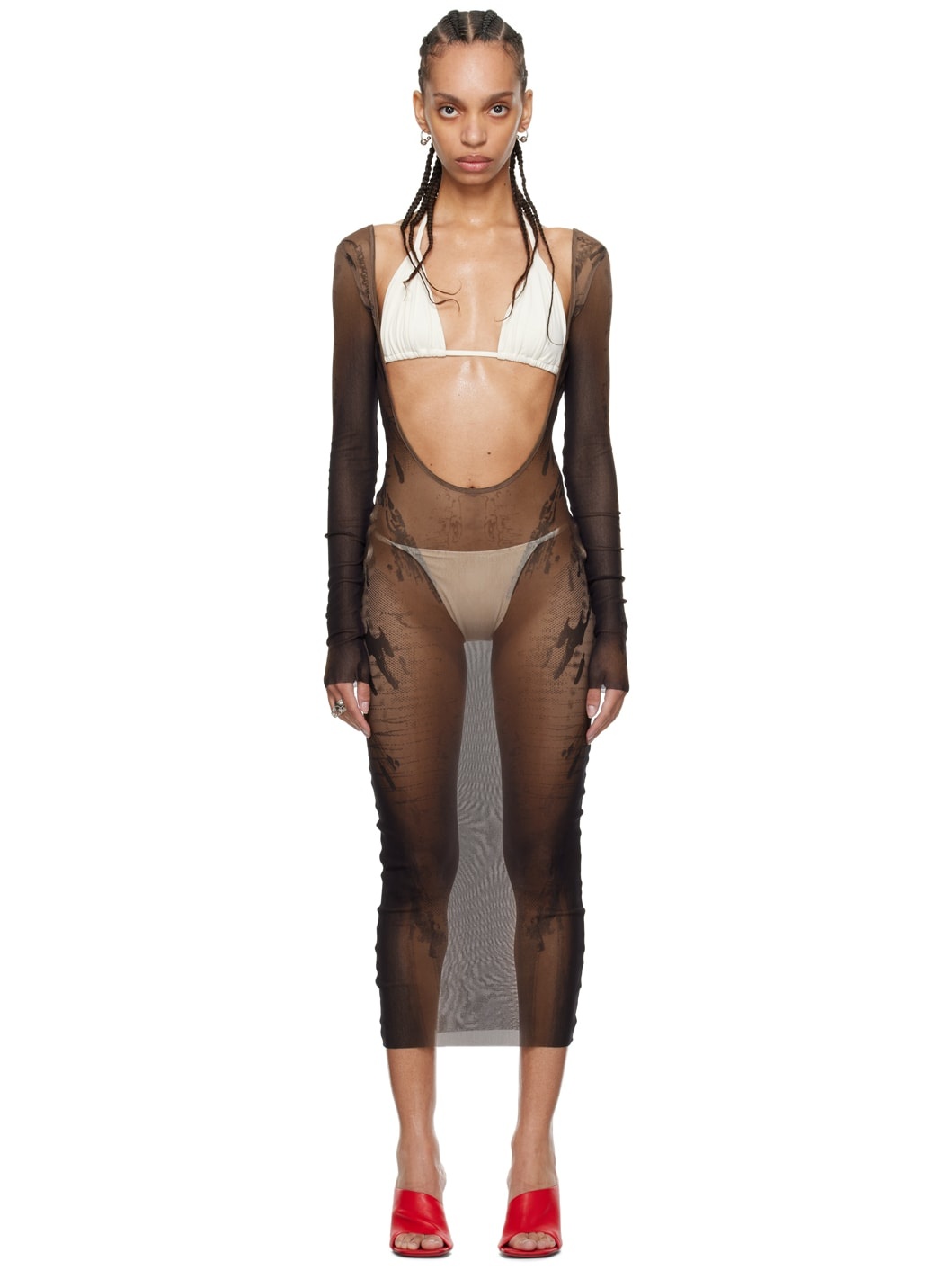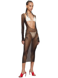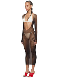 Sheer nylon tulle dress. Graphics printed throughout. · Plunging scoop neck · Raw edge at hem · Locker loop at back collar · Low back Part of the Jean Paul Gaultier x Shayne Oliver collaboration. Supplier color: Brown/Black 100% polyamide. Made in Italy 242808F054009