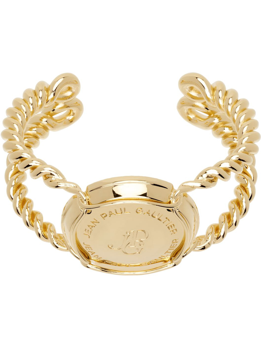 Sculptural open cuff bracelet in gold-tone brass. · Twisted detailing throughout · Logo engraved at face · D2.5" Supplier color: Gold Brass. Made in Italy 252808M142001