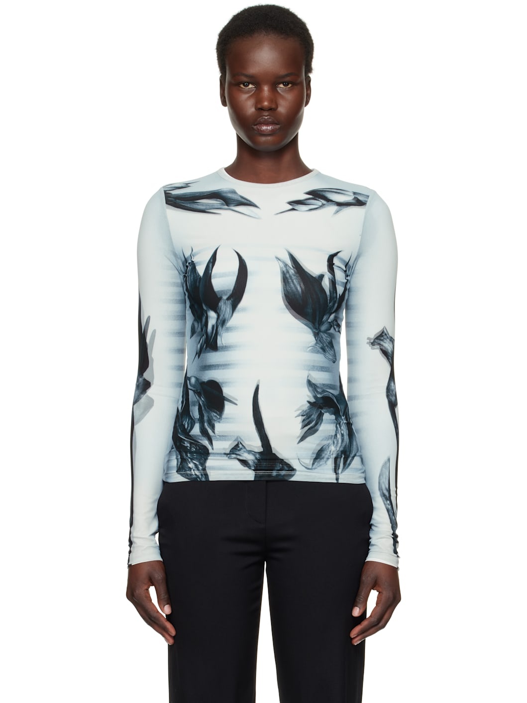Stretch nylon tulle and polyester jersey T-shirt. Stripes and floral pattern printed throughout. · Layered construction · Crewneck · Locker loop at back collar Supplier color: White/Grey/Black Body 1: 87% polyester, 13% elastane. Body 2: 94% nylon, 6% elastane. Made in Portugal 251808F110013