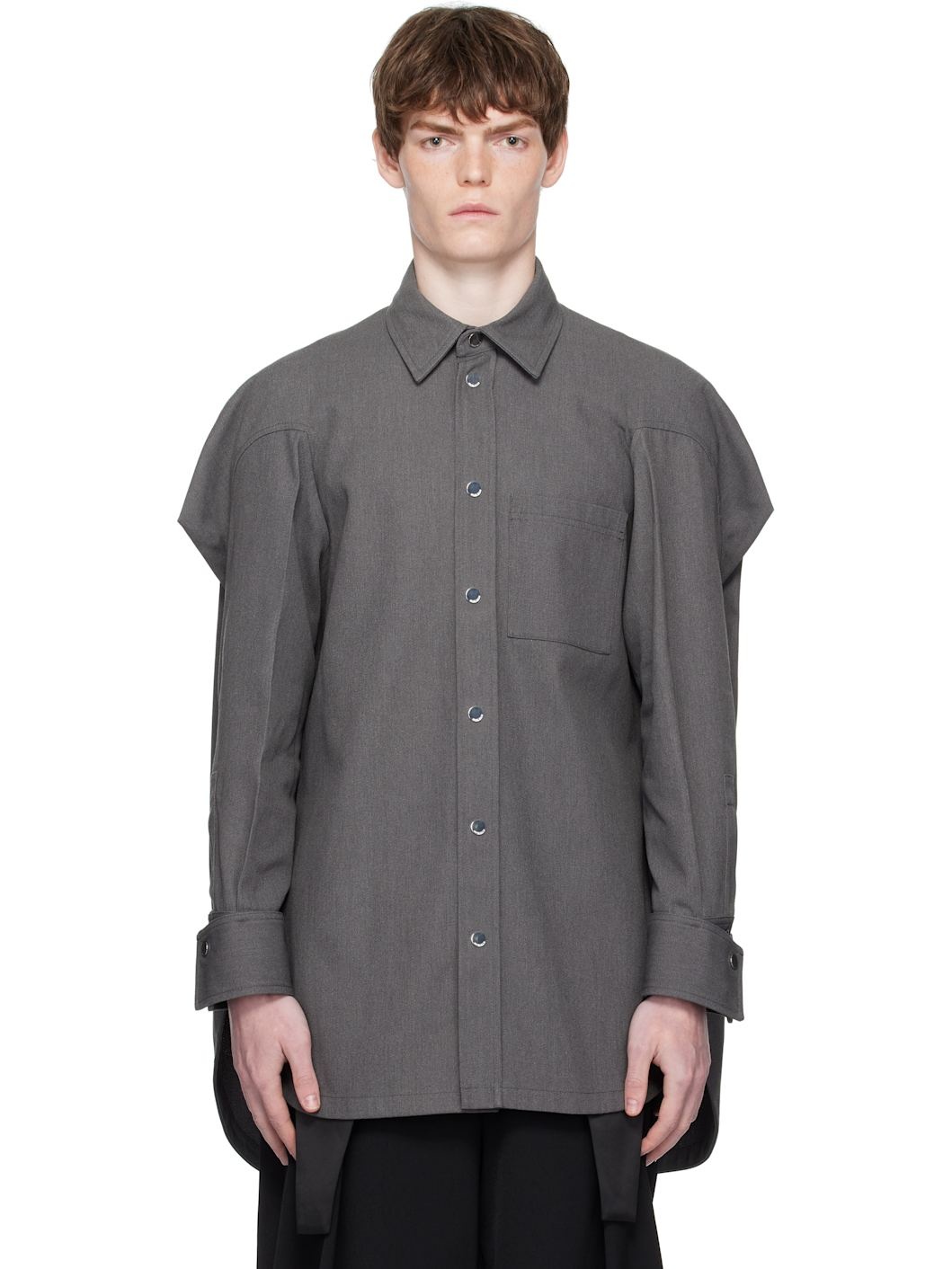 Cotton-blend canvas shirt. · Spread collar · Press-stud closure · Patch pocket at chest · Droptail hem · Draping and vent at shoulders · Press-stud barrel cuffs · Locker loop at back collar · Logo-engraved silver-tone hardware Supplier color: Dark grey 65% polyester, 35% cotton. Made in Italy 252808M192009