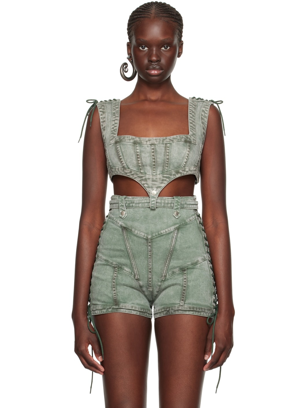 Paneled stretch denim tank top. Fading throughout. · Square neck · Lace-up fastening at shoulder straps and back · Logo flag at front · Press-stud tab and detachable strap at hem · Zip closure at side seam Part of the Jean Paul Gaultier x KNWLS collaboration. Supplier color: Vert de gris 80% cotton, 14% tencel, 4% polyester, 2% elastane. Made in Italy 232808F111016