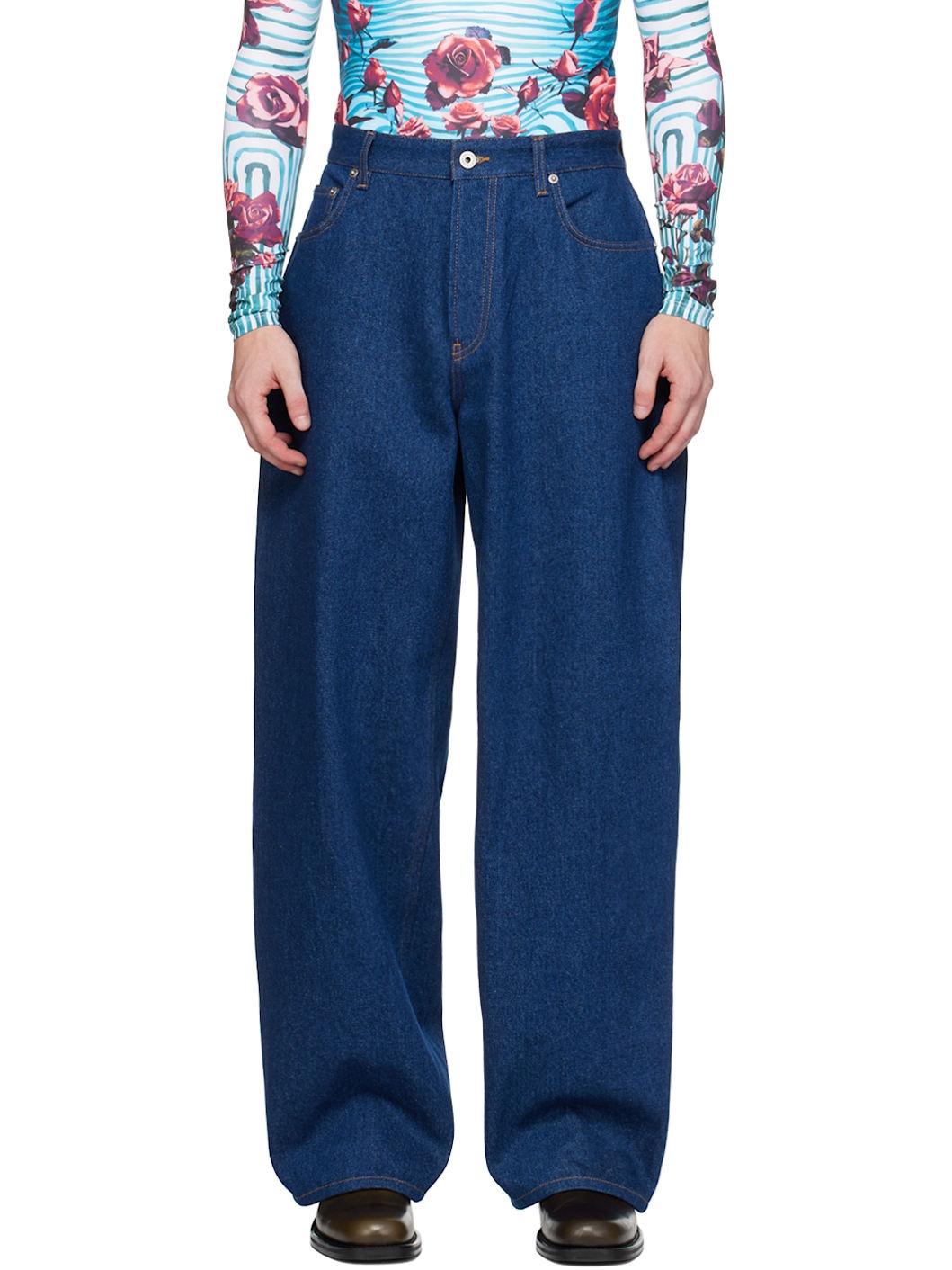 Loose-fit non-stretch denim jeans. · Belt loops · Five-pocket styling · Zip-fly · Stripes at back · Logo-embossed leather pocket at back · Logo engraved silver-tone hardware · Contrast stitching in tan Part of the Fashion Fiction collection. Supplier color: Indigo/White 100% cotton. Made in Italy 242808M186012