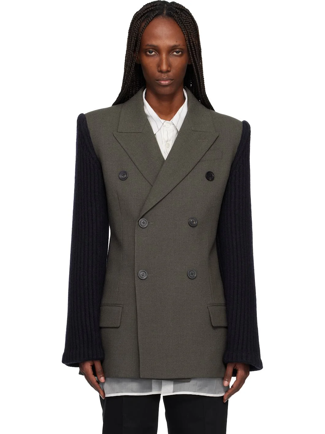 Wool barathea and rib-knit virgin wool blend blazer. · Paneled construction · Peaked lapel · Double-breasted button closure · Welt pocket at chest · Flap pockets at waist · Padded shoulders · Raw edge and stripes at inset poplin cuffs · Logo patch at cuff · Locker loop at back collar · Central vent at back hem · Welt pocket at interior · Full satin and poplin lining Supplier color: Green Body 1: 88% virgin wool, 12% nylon. Body 2: 100% wool. Lining 1: 100% viscose. Lining 2: 78% viscose, 14% silk, 8% cotton. Made in Italy 252808F057000