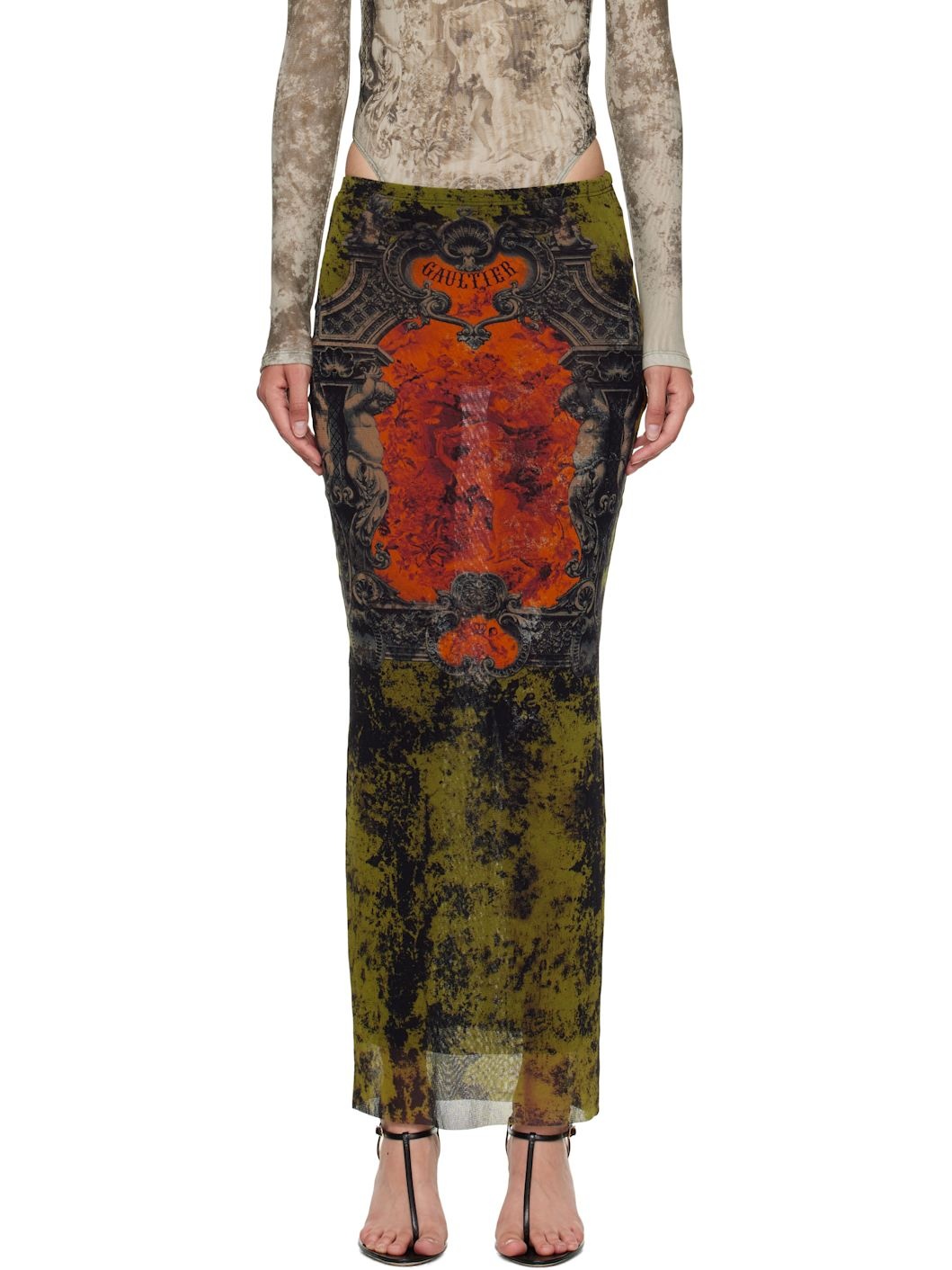 Sheer nylon tulle midi skirt. · Graphic pattern printed throughout · Elasticized waistband · Raw edge at hem · Locker loop at back · Fully lined Supplier color: Orange Body: 100% polyamide. Lining: 100% polyamide. Made in Italy 252808F092002