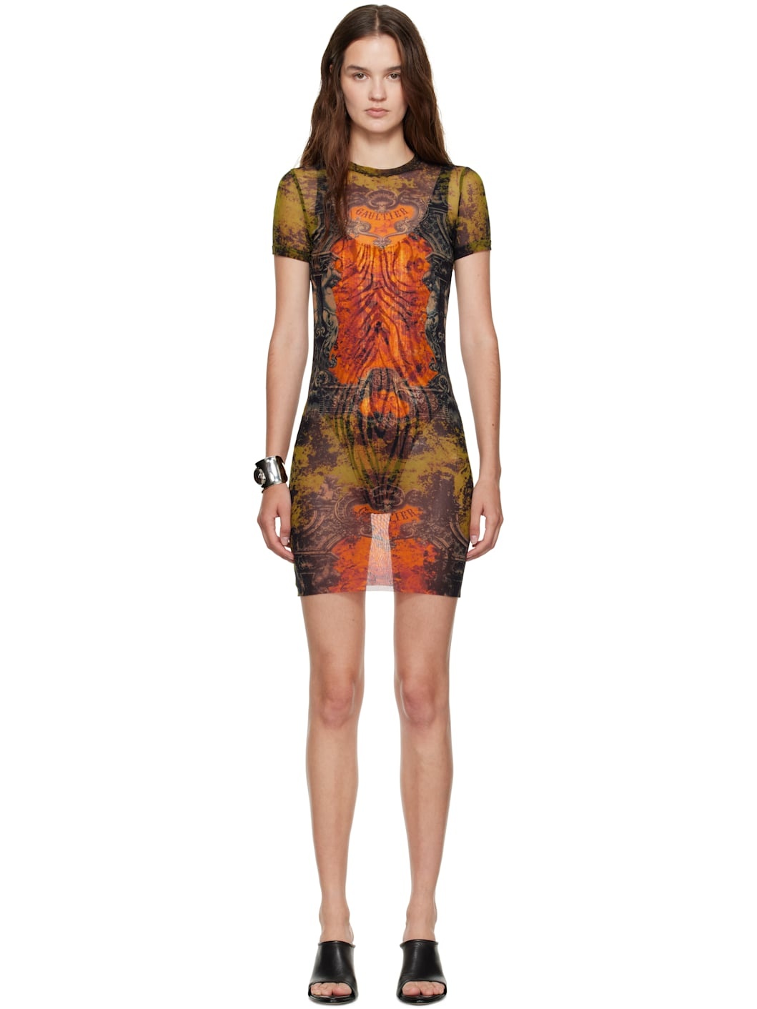 Sheer nylon tulle minidress. · Graphic pattern printed throughout · Crewneck · Logo printed at chest and back · Raw edge at hem · Locker loop at back collar Supplier color: Orange 100% polyamide. Made in Italy 252808F052003