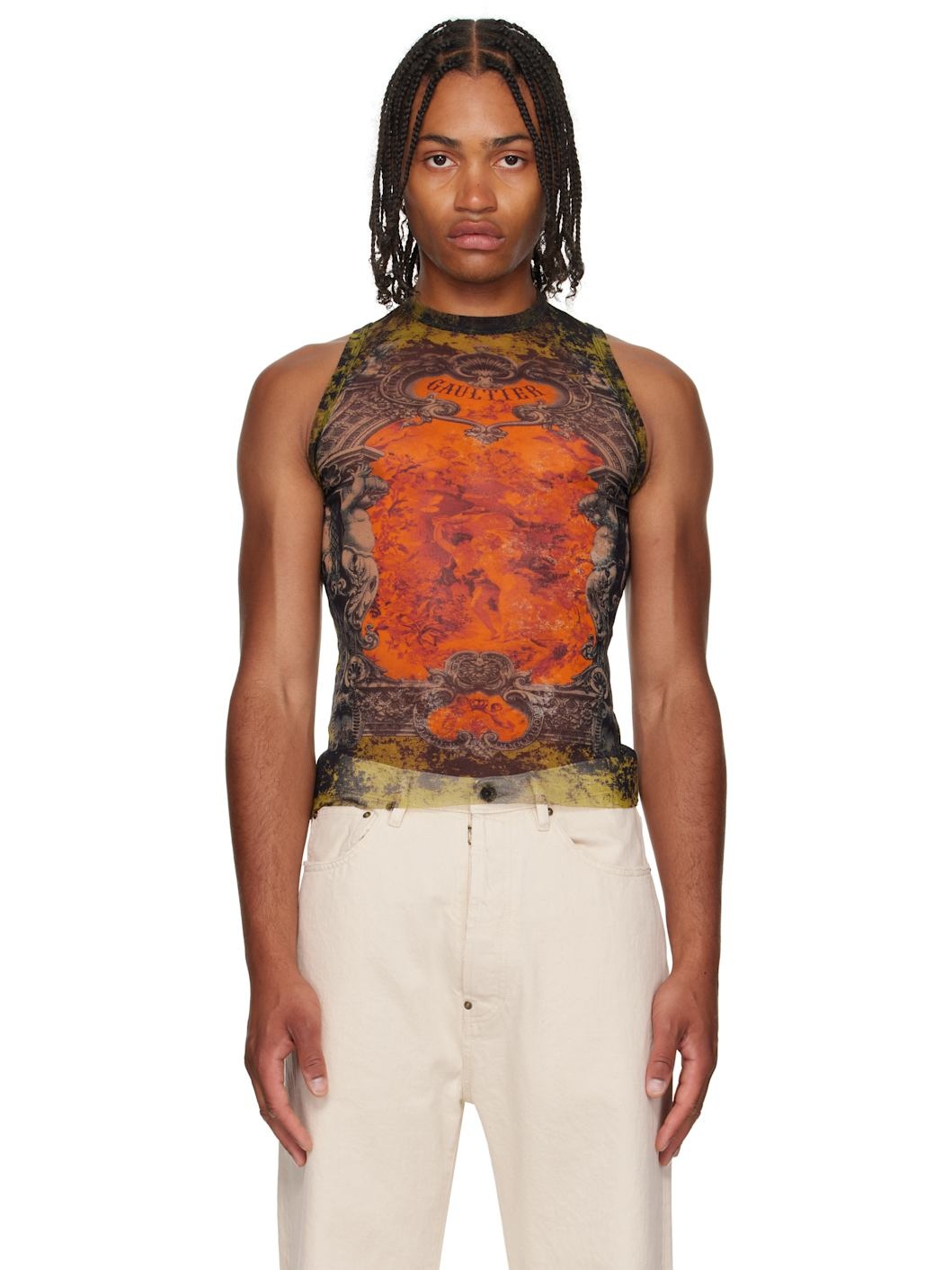 Sheer nylon tulle tank top. · Logo graphic printed throughout · Crewneck · Raw edge at hem · Locker loop at back collar Supplier color: Orange 100% polyamide. Made in Italy 252808M214008