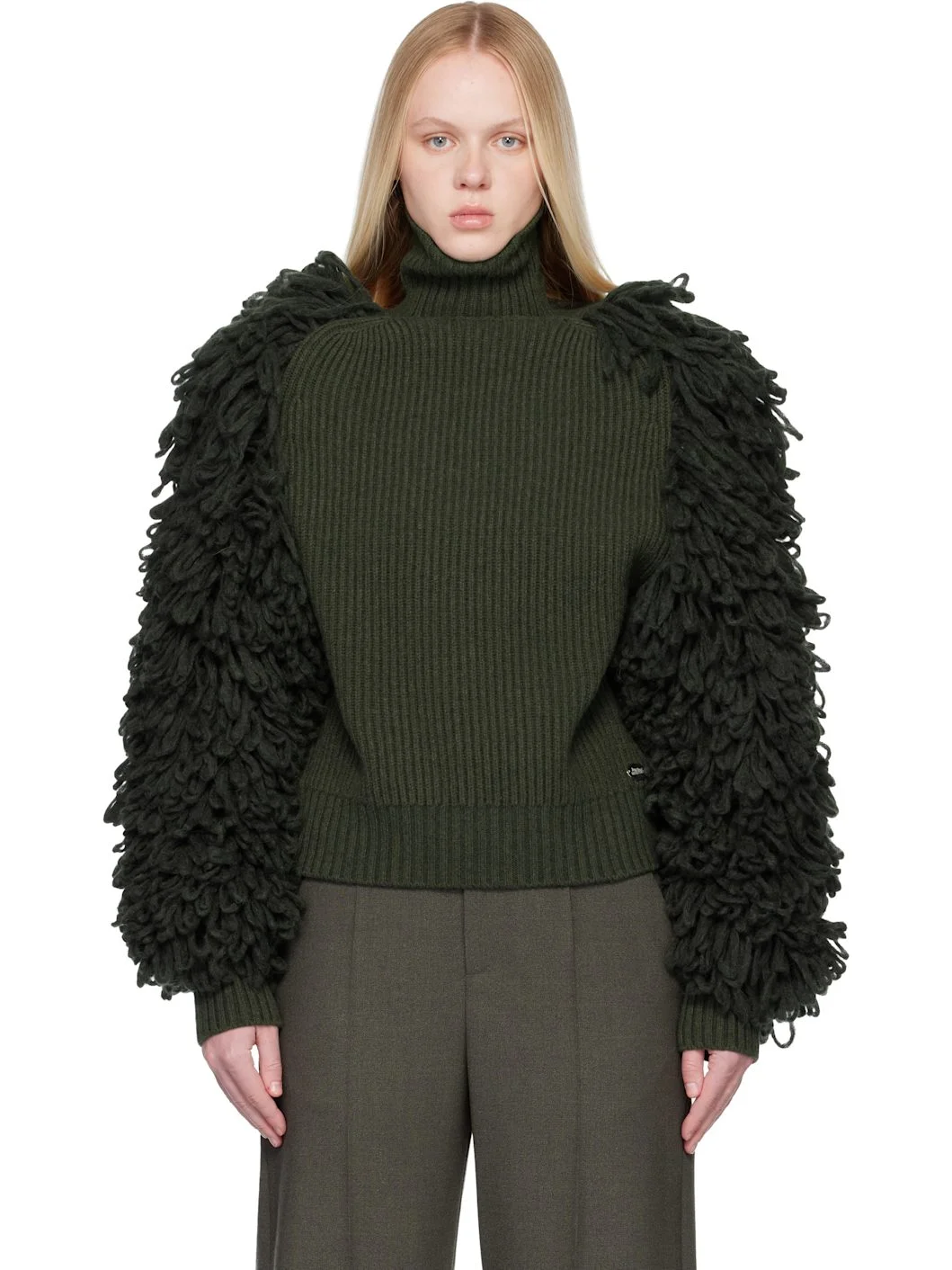 Rib-knit alpaca- and silk-blend sweater. · Slim-fit · Turtleneck · Logo plaque at front · Shoulder pads · Loop-knit detailing at sleeves · Locker loop at back collar Supplier color: Dark khaki 68% alpaca, 22% silk, 10% wool. Made in Italy 252808F099008