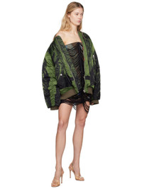 Oversized insulated nylon taffeta bomber jacket. Trompe l'œil graphic printed throughout. · Rib knit stand collar, hem, and cuffs · Zip closure · Flap pockets · Dropped shoulders · Zip pocket at sleeve · Locker loop at back collar · Rubberized logo patch at back · Fully lined · Logo-engraved silver-tone hardware Part of the Fashion Fiction collection. Supplier color: Khaki/Black Body: 100% polyamide. Trim: 42% acetate, 37% wool, 19% polyamide, 2% elastane. Fill: 100% polyamide. Lining: 100% polyester. Made in Italy 242808F058000