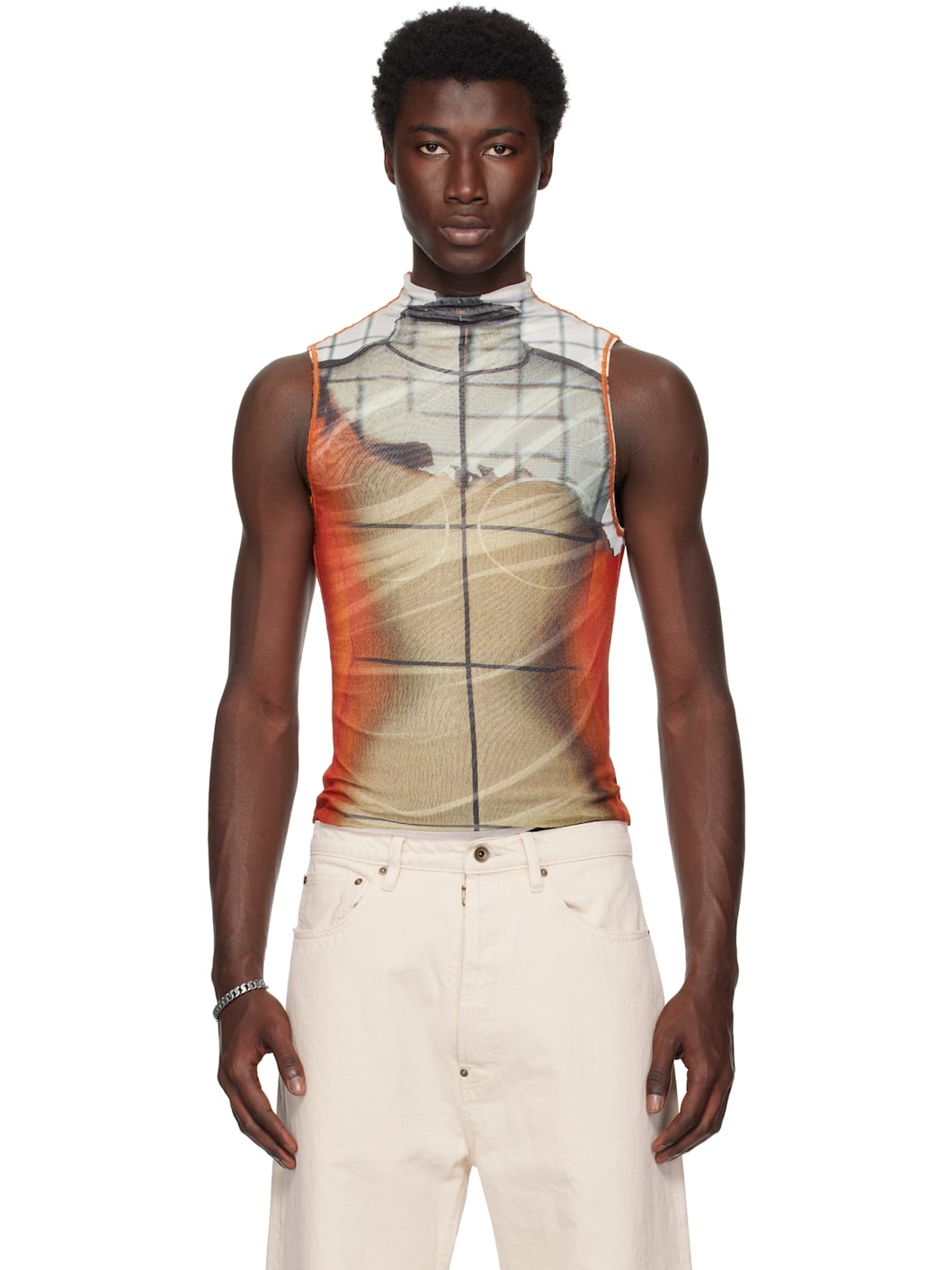 Double-faced nylon mesh tank top. · Semi-sheer · Graphic and stripes printed throughout · Locker loop at back collar Supplier color: Orange/White/Black 100% polyamide. Made in Italy 252808M214006