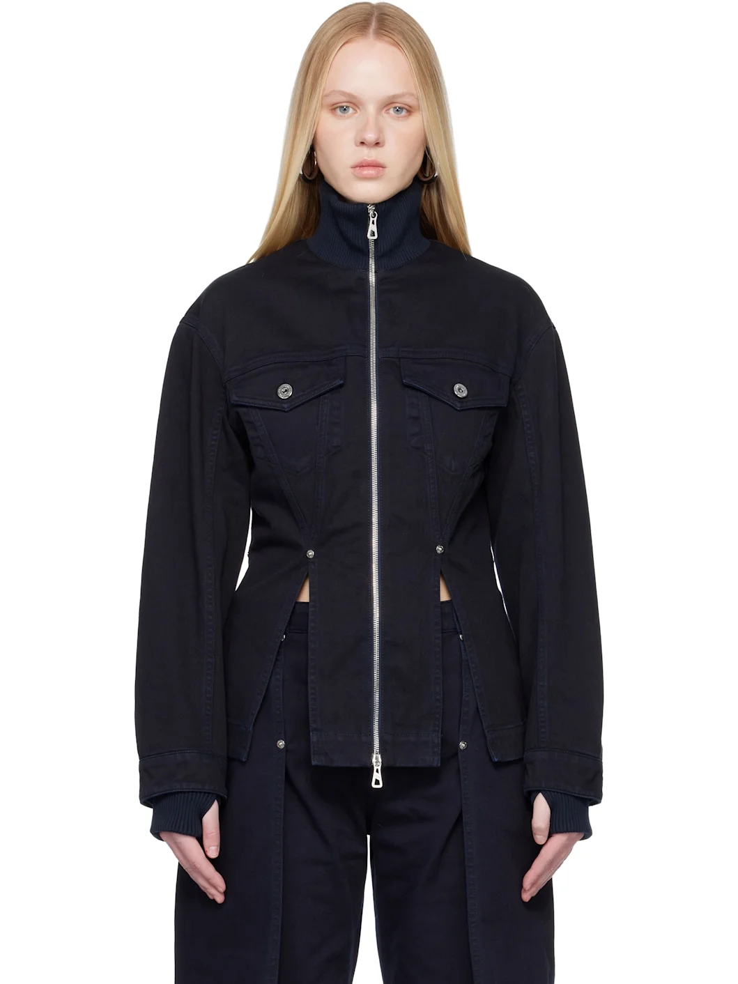 Non-stretch denim jacket. · Rib-knit mock neck · Two-way zip closure · Flap pockets at chest · Slits at hem · Thumbhole at inset rib-knit cuffs · Locker loop at back collar · Logo patch at back hem · Unlined · Logo-engraved silver-tone hardware Supplier color: Blue Body: 100% cotton. Trim: 3% elastane, 7% polyamide, 90% polyester. Made in Italy 252808F060006