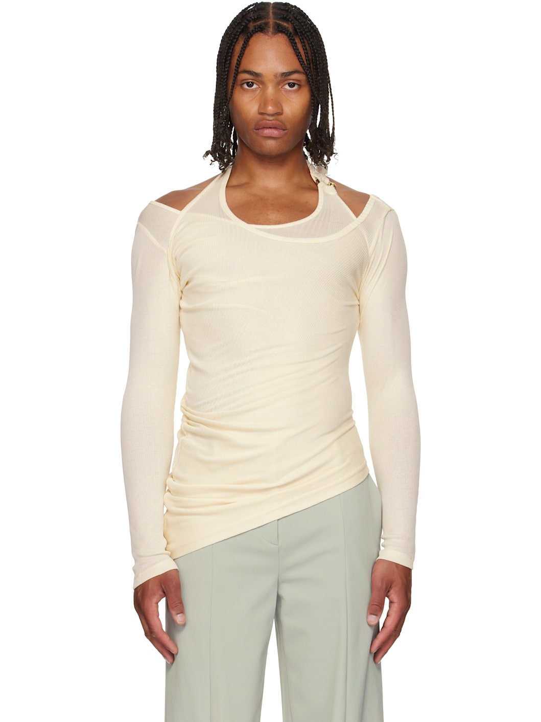 Ribbed cotton jersey top. · Layered construction · Modified neck · Logo hardware and extended trim at neck · Asymmetrical hem · Locker loop at halter strap Supplier color: Ecru 100% cotton. Made in Portugal 252808M213025
