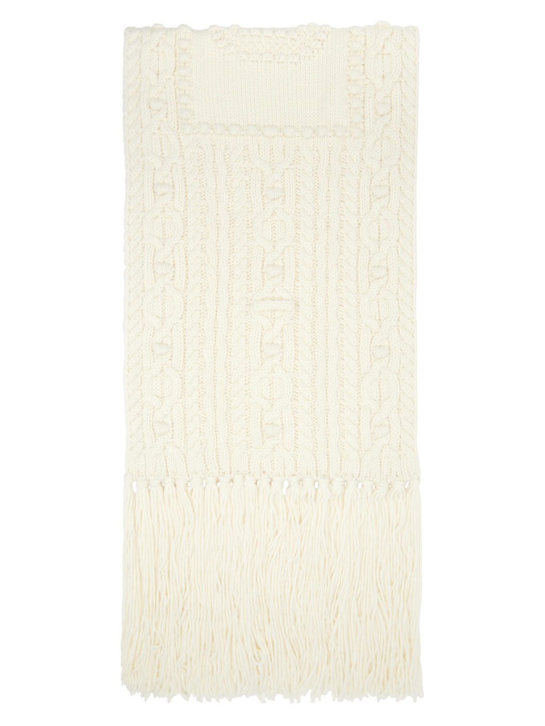 Rectangular cable knit virgin wool- and polyester-blend scarf in off-white. · Logo embroidered at face · Fringed detailing at ends · L104" x W17.5" Supplier color: Cream 50% virgin wool, 50% polyester. Made in Italy 242808F028015