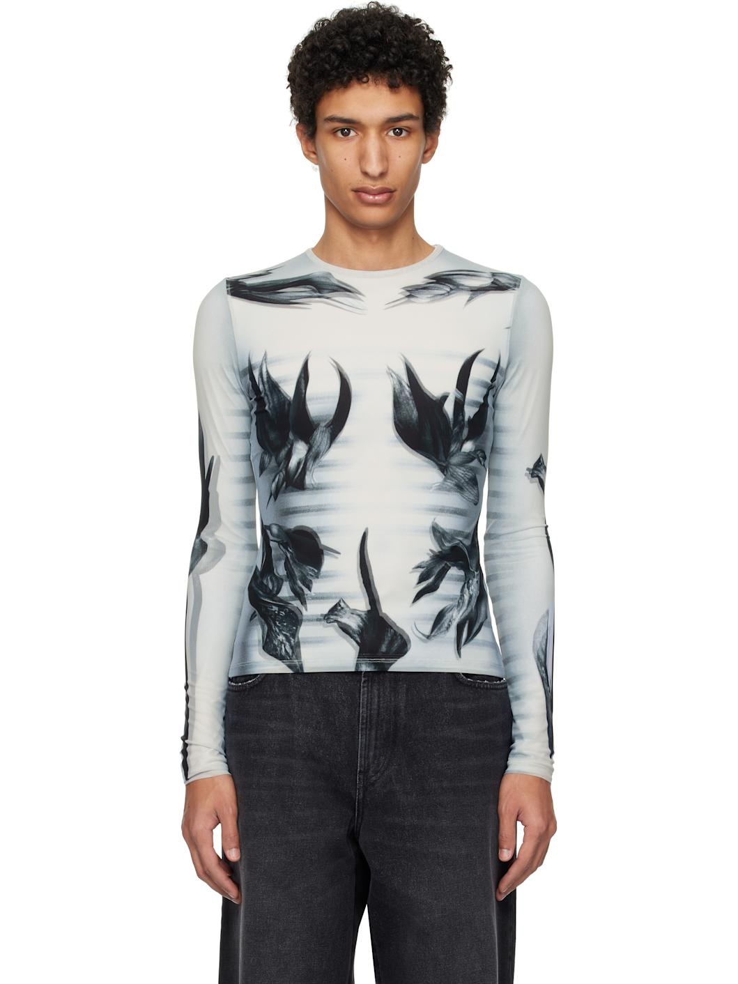 Stretch semi-sheer polyester tulle and nylon jersey T-shirt. Graphic printed throughout. · Layered construction · Crewneck · Locker loop at back collar · Fully lined Supplier color: White/Grey/Black Body 1: 87% polyester, 13% elastane. Body 2: 94% polyamide, 6% elastane. Made in Portugal 251808M213007