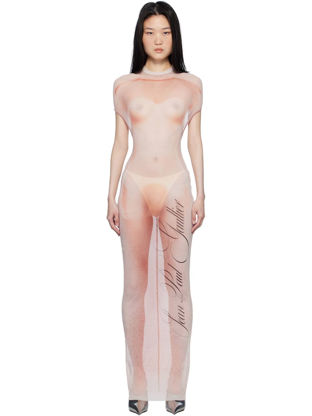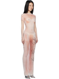 Semi-sheer nylon tulle maxi dress. Trompe-l'œil graphic printed throughout. · Crewneck · Logo printed at front · Raw edge at hem · Locker loop at back collar · Open back · Ruching at back Supplier color: Pale pink/Dusty pink 100% polyamide. Made in Italy 251808F055010