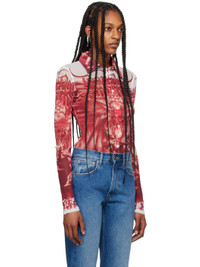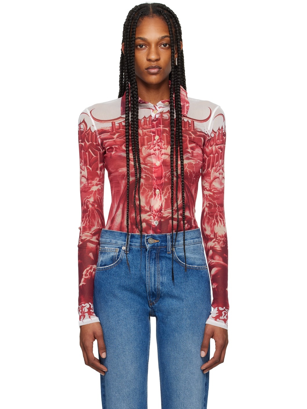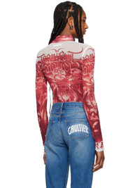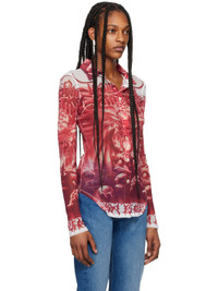 Semi-sheer nylon mesh shirt. Logo graphic printed throughout. · Spread collar · Button closure · Shirttail hem · Locker loop at back collar Part of the Tres Gaultier collection. Supplier color: White/Red 100% polyamide. Made in Italy 242808F109004