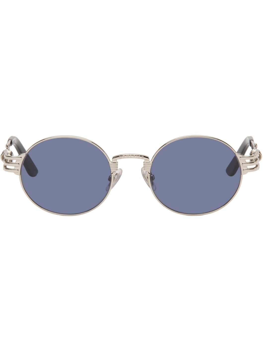 Round metal-frame sunglasses. · Blue lenses, category 3 · 100% UVA/UVB protection · Logo engraved at bridge · Adjustable rubber nose pads · Spring hardware at temples · Mazzucchelli acetate temple tips · Includes case · Size: 51.21 145 Supplier color: Silver Metal. Made in France 252808M134005
