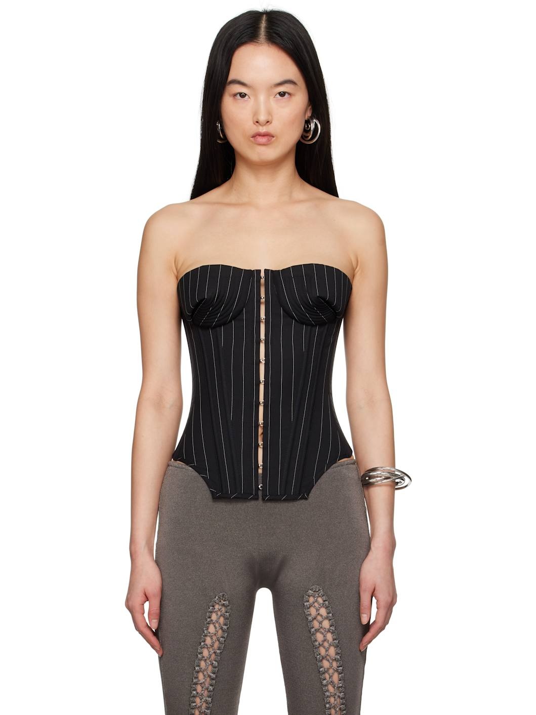 Semi-sheer virgin wool twill corset. Pinstripes and boning throughout. · Paneled construction · Sweetheart neck · Pleat at padded cups · Hook-eye fastening at front · Asymmetric hem · Stretch polyester mesh panel at back · Lace-up closure at back · Silver-tone hardware Available exclusively at SSENSE. Supplier color: Black/White Body: 100% virgin wool. Lining: 69% polyester, 31% elastane. Made in Italy 251808F111008
