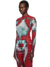 Semi-sheer nylon tulle T-shirt. Graphic and check pattern printed throughout. · Crewneck · Raw edge at hem and cuffs · Locker loop at back collar Available exclusively at SSENSE. Supplier color: Red/Blue duck 100% nylon. Made in Italy 251808F110024
